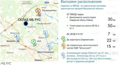Лот 908527 Предложение от Собственника! Продается Склад класса ''А'' Мерседес-Бэнц РУС в Глазово - Индустриальный парк ''Северное Шереметьево'' общей площадью 51 631,3 м2Основные характеристики:Расстояние до МКАД 30 кмСдан в эксплуатацию: июль 2016 Индивидуальный проект застройки крупнейшего мирового автопроизводителя.Функциональная инфраструктура, высокое качество отделки и оборудования.Площадь земельного участка - 15,7 га (позволяет расширить складские площади до 67 700 м2) Площадь по внутреннему. обмеру - 51 631,3 м2 (вкл. склад 46 750, 1 м2 и офисы -4 881 м2)Шаг колонн - 24 метра, нагрузка на пол - 10 тонн на м2Зона хранения товаров с классом опасности, шинный склад30 доков, 3 груза-пассажирских лифтаНа территории располагаются 2 трансформаторные подстанции, дизельная электростанция, газовая котельная. В цену включено: затраты на электричество, НДС 20%.Чтобы получить ПОДРОБНУЮ ПРЕЗЕНТАЦИЮ С ПЛАНИРОВКОЙ И ФОТОГРАФИЯМИ, звоните или отправьте свой email и номер телефона в сообщении на портале. Высылаем в течение 15 минут по запросу! Конт. лицо: Василий Анатольевич, доб. 221, ЛОТ 908527