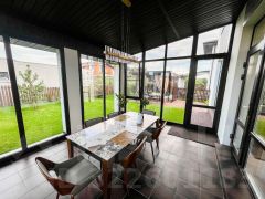 ID 1387 Без комиссии для покупателя. Замечательный дом в закрытом коттеджем поселке Европа-2. Небольшой, но очень уютный и высокофункциональный дом станет прекрасным выбором для Вашей семьи. Полностью готов к всесезонному и комфортному проживанию: выполнен качественный современный ремонт под ключ с использованием дорогих премиальных материалов (полы - канадский орех, итальянская плитка и т.д.), меблирован, укомплектован необходимой для проживания техникой (Miele и др.).Установлена приточная вентиляция и дополнительное индивидуальное кондиционирование дома.Планировка: 1 этаж: прихожая, холл, кухня-столовая, рабочая кухня, зимний сад, гостиная с камином, гостевая спальня, гардеробная, с/у, кладовая.2 этаж: холл, хозяйская спальня с гардеробной с/у+ванна, кабинет, спальня с с/у будуарной+ванна.