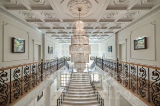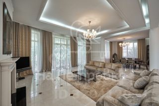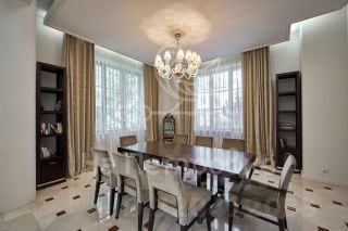 ID 772Трёхэтажный коттедж с бассейном в КП НоваховоПлощадь дома с 4-мя спальнями: 654 кв.м. Видовой участок с ландшафтным дизайном: 19 соток На первом этаже: парадный холл с лифтом, гостиная, каминный зал, кухня-столовая, санузел, гараж в контуре дома для 2-х автомобилей.На втором этаже: 4 спальни с ванными комнатами и 3 санузлами, библиотека.На третьем этаже: кабинет, бильярдная с санузлом.На больших открытых балконах с колоннами будет приятно отдыхать в тёплое время года и любоваться красивыми видами. Панорамное остекление и высокие потолки делают помещения невероятно просторными и уютными. Роскошный интерьер дополнен изысканной мебелью и люстрами. На участке построен двухуровневый хозблок, площадью 105 кв.м., для персонала.Есть большой открытый бассейн с зоной для отдыха. А на летней веранде под крышей будет удобно накрывать на стол. На участке аккуратно уложен газон, высажено много деревьев и кустарников, что создаёт кулуарную атмосферу. Коттеджный посёлок расположен в 10 км. от МКАД. По скоростному Новорижскому шоссе до Москвы можно доехать за 15-20 минут. КП Новахово прекрасно подходит для постоянного проживания в Подмосковье в окружении живописных природных пейзажей. Вблизи посёлка находится лес и протекает река Липка. В посёлке есть собственная развитая инфраструктура: детские и спортивные площадки, детский городок, большой Торгово-развлекательный центр, где представлены магазины, рестораны, бар, фитнес - клуб, СПА-центр, отель, аптека, химчистка, отделения банков и многое другое. Буквально за 5-10 минут на машине можно доехать до частной школы Ковчег ХXI, конноспортивного комплекса Новый Век и теннисного корта. Жителям также доступна богатая инфраструктура Жуковки.