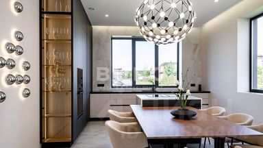 ID 8629Современный дом в КП ''Новорижский''Загородный дом с 4-мя спальнями, общей площадью 300 м², представлен ''под ключ'' и расположен на видовом участке 6 соток. Кирпичный дом с комбинированным фасадом построен в стиле известного архитектора Ф.Л. Райта из высококачественных материалов в престижном, экологически чистом Истринском районе Подмосковья. Продуманная до мелочей планировка включает: входную группу, кухню-столовую, гостиную, 3 спальни, кабинет, который можно сделать дополнительной спальней, 4 ванных комнаты, 4 гардеробные, котельную, постирочную и террасы.Монолитные перекрытия и фундамент гарантируют прочность и долговечность конструкции здания. На плоской кровле уложена надежная мембрана. В доме выполнен дизайнерский ремонт с применением премиальных отделочных материалов. Современный интерьер укомплектован стильной мебелью и элементами декора. Эффектная лестница на второй этаж с подсветкой и стеклянными перилами гармонично дополняет оформление. Панорамные окна ''в пол'' фирмы ''Salamander'', большая площадь остекления и высокие потолки визуально увеличивают внутреннее пространство. В комнатах всегда много естественного света, что позволяет оптимально расходовать электроэнергию. Дом оснащен электрикой и сантехникой ведущих импортных производителей. Центральные коммуникации обеспечивают городской комфорт в течение всего года: газ, электричество, водоснабжение и канализация. Построен роскошный навес для парковки 2-х автомобилей. Предусмотрена зарядка для электромобиля. На ровном участке выполнен ландшафтный дизайн, аккуратно уложен газон и растут взрослые деревья. Благодаря грамотному расположению дома на участке свободного места достаточно для строительства беседки с зоной барбекю или детской площадки. Наши надежные партнеры будут рады помочь воплотить любые задумки. Элитный коттеджный посёлок ''Новорижский'' - идеальное место для роскошной жизни на природе вблизи Столицы. Новая Рига - одно из самых востребованных подмосковных направлений для приобретения загородной недвижимости. Живописные пейзажи, чистейший воздух, отсутствие поблизости промышленных производств и развитая инфраструктура - лишь часть преимуществ ''Новорижского''. На ухоженной территории созданы водные каналы, 3 парка с озёрами, широкими бульварами и детскими площадками. На берегу большого озера обустроен пляж для купания в теплое время года. Для любителей спорта организованы: теннисные корты, волейбольная и баскетбольная площадки. В посёлке абсолютно безопасно благодаря профессиональной службе охраны, патрулированию, видеонаблюдению и строгой пропускной системе. Собственная сервисная служба работает в режиме быстрого реагирования, решает возникающие хозяйственные вопросы, поддерживает чистоту и порядок в КП. Жителям доступна развитая инфраструктура Новой Риги. В 3-5 минутах на машине работают: салон красоты, клиника, ТЦ ''Pokrovsky'', ТЦ ''Княжий Двор'', ''Agalarov Golf Country Club'', ''Novaya Riga Outlet Village'', супермаркеты ''Азбука вкуса'', ''Мираторг'' и ''ВкусВилл''. В непосредственной близости доступны: детские сады, учебные учреждения, магазины, аптеки, фитнес-клубы и отделения банков.