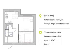 Сдается уютная однокомнатная квартира в ЖК ''Отрада'' — 1 очередь, в 7 минутах на автомобиле от станции метро ''Пятницкое шоссе''. Общественный транспорт (остановка в 2 минутах от дома) до станций метро Пятницкое шоссе, Митино, Сходненская, Тушинская (+ можно доехать и немного пройти пешком до МЦД Волоколамская).Общая площадь — 41 кв. м, жилая — 20 кв. м, кухня — 8 кв. м. Квартира расположена на первом этаже пятиэтажного дома. В квартире летом не жарко (не солнечная сторона, но за счет большого окна в гостиной светло и уютно), а зимой — не холодно. Высокий первый этаж + большие батареи.В квартире сделан дизайнерский ремонт, что создает атмосферу комфорта и уюта. Комната органично разбита на две зоны: на гостевую зону (телевизор, диван, рабочий стол) и спальную зону (двуспальная кровать, шкаф). На кухне и в комнате есть вся необходимая мебель. Ванная комната оборудована как ванной, так и душевой кабиной, поэтому можно выбрать удобный способ расслабиться после долгого дня. На кухне есть холодильник, в комнате — телевизор, а также стиральная машина. Варочная панель, духовой шкаф, вытяжка — Gorenje. Кровать c подъемным механизмом и матрас - Askona. Раскладной диванДом ухоженный, с наземной парковкой. Подъезд оборудован пандусом, что делает его доступным для всех категорий жильцов. Район располагает развитой инфраструктурой. В пешей или велосипедной доступности от дома: ТЦ Отрада, магазины, конный клуб, лес, река, кафе, рестораны, спортзал, парикмахерские, пекарни, пункты выдачи Ozon и Wildberries, Мои Документы, детский сад, школа, клиника Медси и т. д.Условия аренды: квартира сдается на длительный срок. Прекрасный вариант для одного человека или пары.Предоплата за 1 месяцЗалог 65 000 ₽