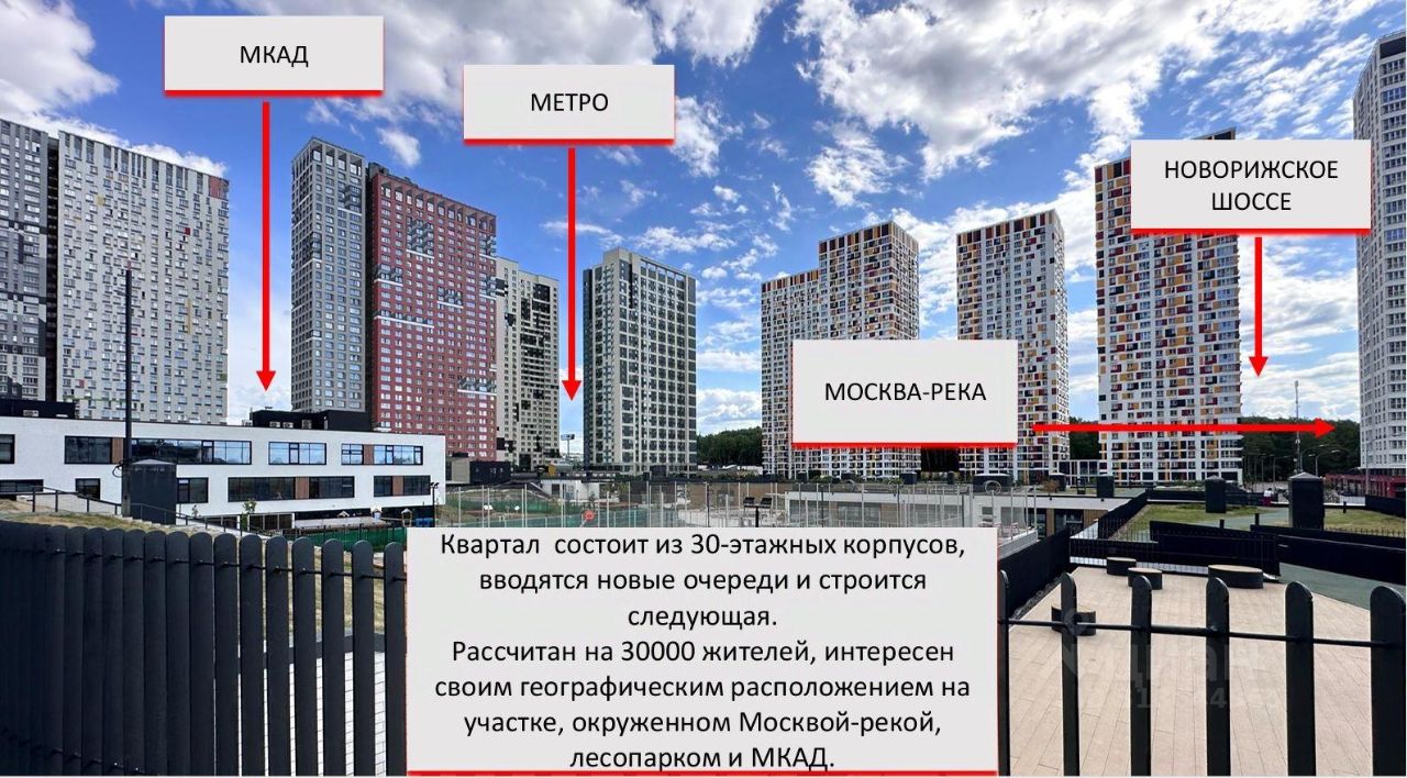 Помещение 11 площадь 77,5 м2 корпус 15 (стилобат 3) первая линия отдельный вход высота потолков - 4 м электрическая мощность - 15 кВт дом сдан, каникулы. Квартал состоит из 30-этажных корпусов, вводятся новые очереди и строится следующая. Рассчитан на 30000 жителей, интересен своим географическим расположением на участке, окруженном Москвой-рекой, лесопарком и МКАД. Метро Липовая роща - 2027 год.
