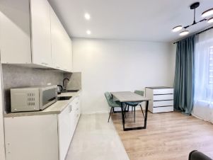 Отличная, чистая светлая студия с современным ремонтом. Укомплектована необходимой мебелью и бытовой техникой. Есть всё необходимое для комфортного проживания. Застекленная лоджия. Квартира расположена в новом современном доме. Рядом магазины, салоны, прогулочные зоны, остановка общественного транспорта . Удобный выезд на МКАД. Квартира готова к проживаниюПредоплата за 1 месяцЗалог 35 000 ₽