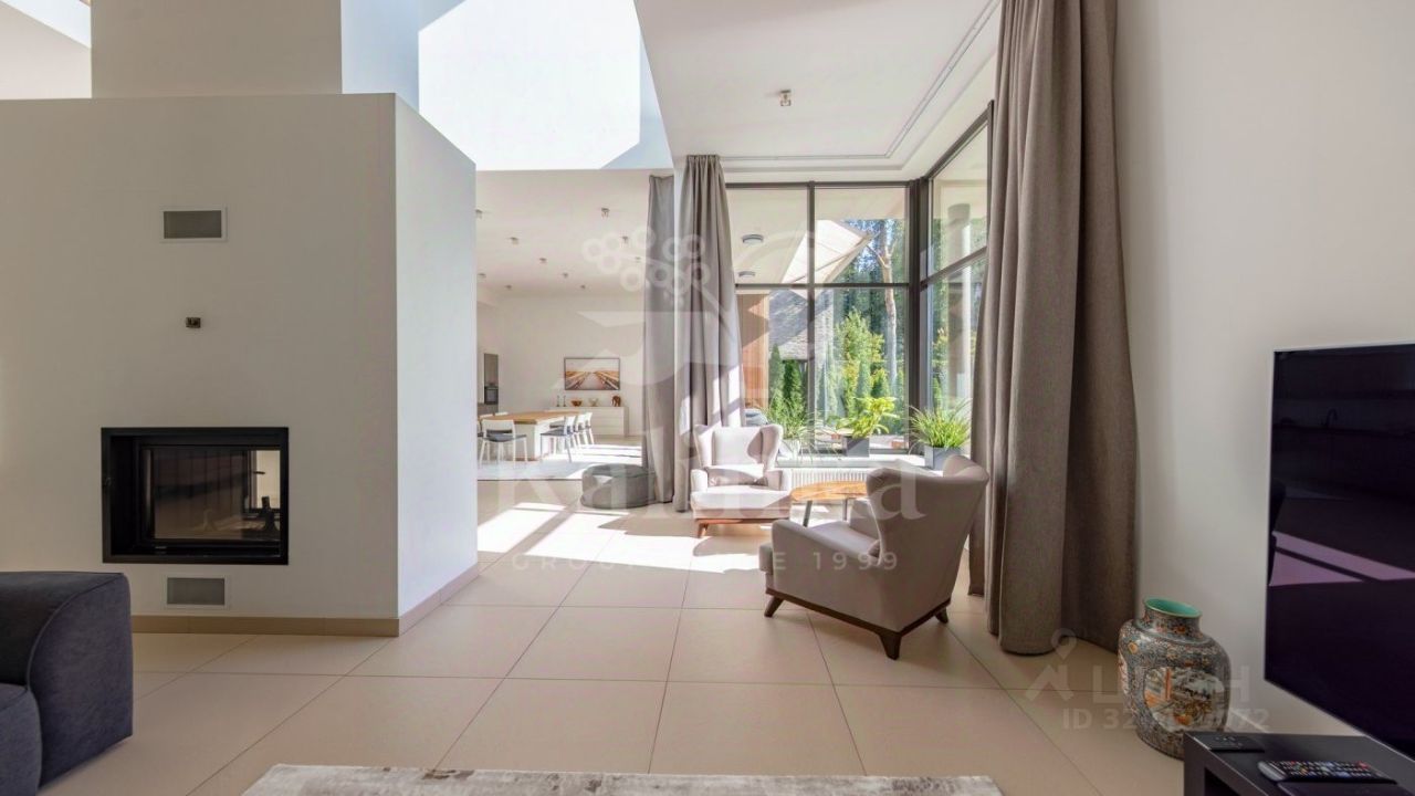 Жилой Комплекс Резиденция Рублево, 1 км Новой Риги, напротив Мякининской поймы. Дом общей площадью 450 кв.м. располагает: 5 спален, 5 с/у, гостиная, кухонная зона, гардеробные, кабинет, камин, хозяйственные помещения, панорамное остекление, террасы, паркинг. Дом меблирован. Участок камерно расположен, выполнен ландшафтный дизайн. Поселок строго охраняем, видеонаблюдение по периметру поселка, на территории поселка: парковые аллеи, детский сад, в 5-ти минутах на автомобиле Крокус Сити, инфраструктура Рублево-успенского шоссе, пляж Рублево, гимназия имени Примакова, до центра Москвы 15 минут на автомобиле.