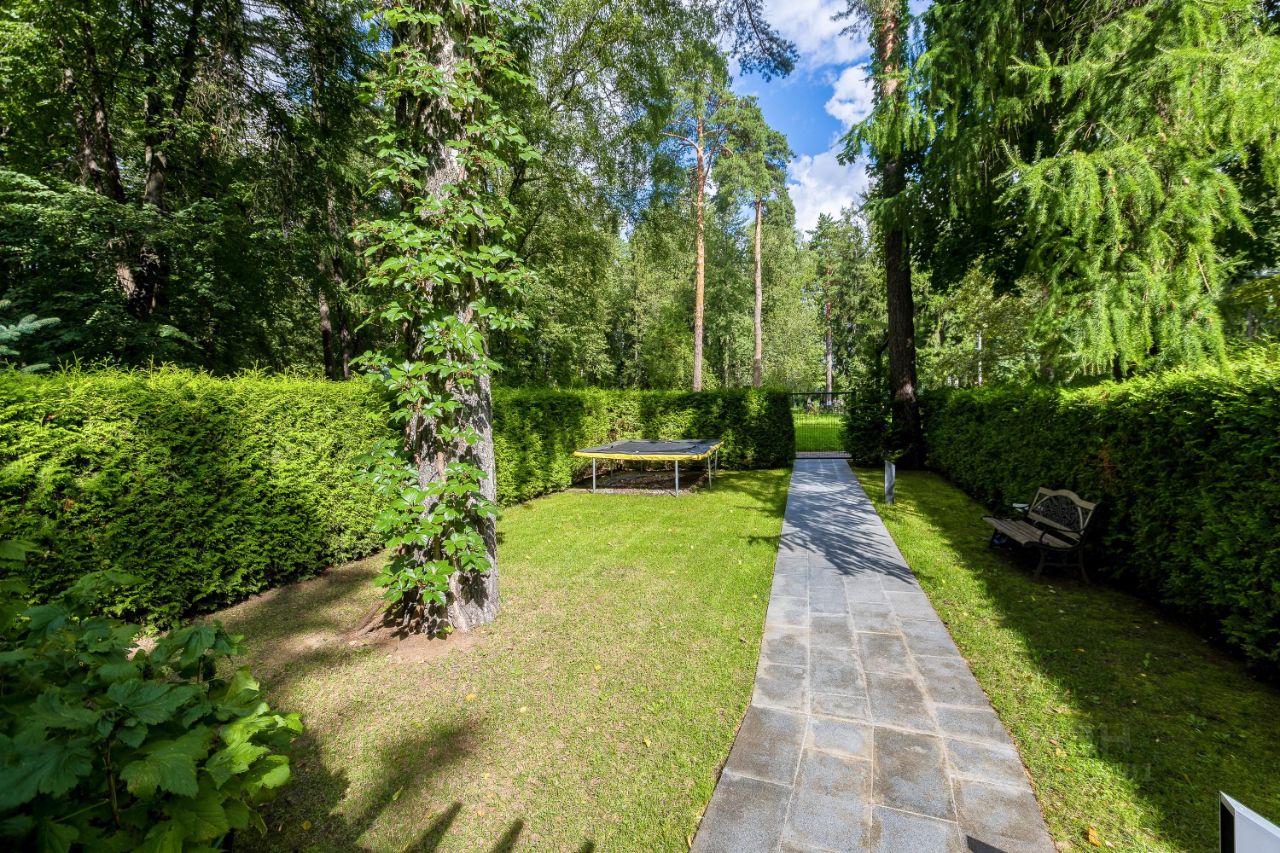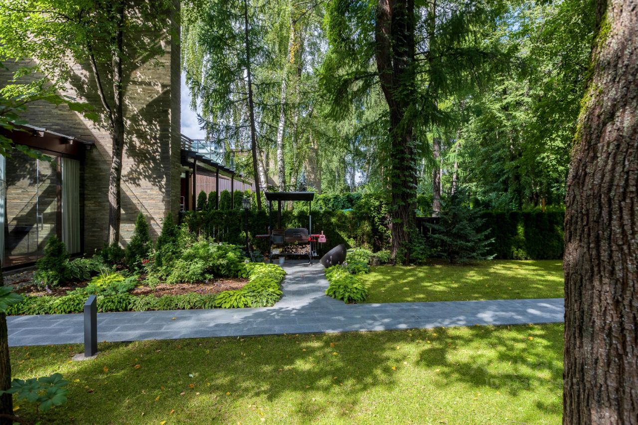 ОКП. Опалиха. Кирпичный дом в классическом стиле. Гостиная с камином, 5 спален, сауна, спортивный зал. На участке ландшафтный дизайн высокого уровня, освещение, дорожки, лесные и плодовые деревья, газон.