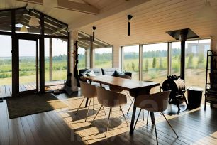 Современный дом с панорамными окнами и видом на просторы природы, с камином. Дубльдом кедр65. Уникальное расположение ДубльДома на склоне (перепад более 2 метров) позволяет круглый год наслаждаться видами ''в горизонт'' и на лес без каких-либо заборов. Поселок расположен в экологически чистой природной зоне - в заказнике Москворечье. Формат поселка без заборов позволяет гулять по нему с видами на лес и дома. Сам посёлок огорожен, въезд по пропускам. В доме комфортно разместиться семье с детьми. Или двум семьям с детьми. Также наш дом выбирают пары. Из досуга в доме: настольные игры, детские игрушки, книги. Крытая веранда с удобными креслами, костровая зона, мангальная зона, казан - все для Вас. Есть бесплатная доставка ВкусВилл, Яндекс маркет, озон. Три спальни и просторная гостиная. В двух спальнях 2сп кровати (160х200см, 140х200см), в третьей спальне: 2х этажная кровать, раскладной диван (спальное место 120х190см), в гостиной раскладной диван (110х195см). На кухне: варочная плитка, духовка, посудомоечная машина, холодильник, чайник, кофемашина Nespresso, тостер, вся посуда для еды и приготовления пищи. В каждой комнате обогреватель. Ванная, туалет, горячая вода, стиральная машина. Есть WiFi. Яндекс-Алиса. В посёлке есть детская площадка, баня с чаном, прудик. Рядом расположены отличные места для прогулок с живописными видами вдоль Москва-реки, устье реки Руза, комплекс Хаски-деревня, магазины, рестораны, конные прогулки. А также можно доехать до музея Бородино, усадьбы керамики и др. Цена за ночь:вс-чт 8900р пт-сб 13900р Стоимость указана за 2х человек, бронирование от 2х ночей.Дом не подходит для шумных мероприятий и вечеринок. Можно с маленькими собачками с доплатой 1000р по согласованию. При заезде от 3х суток индивидуальный расчёт, звоните, пишите. Приезжайте, будем рады Вам!Залог 10 000 ₽