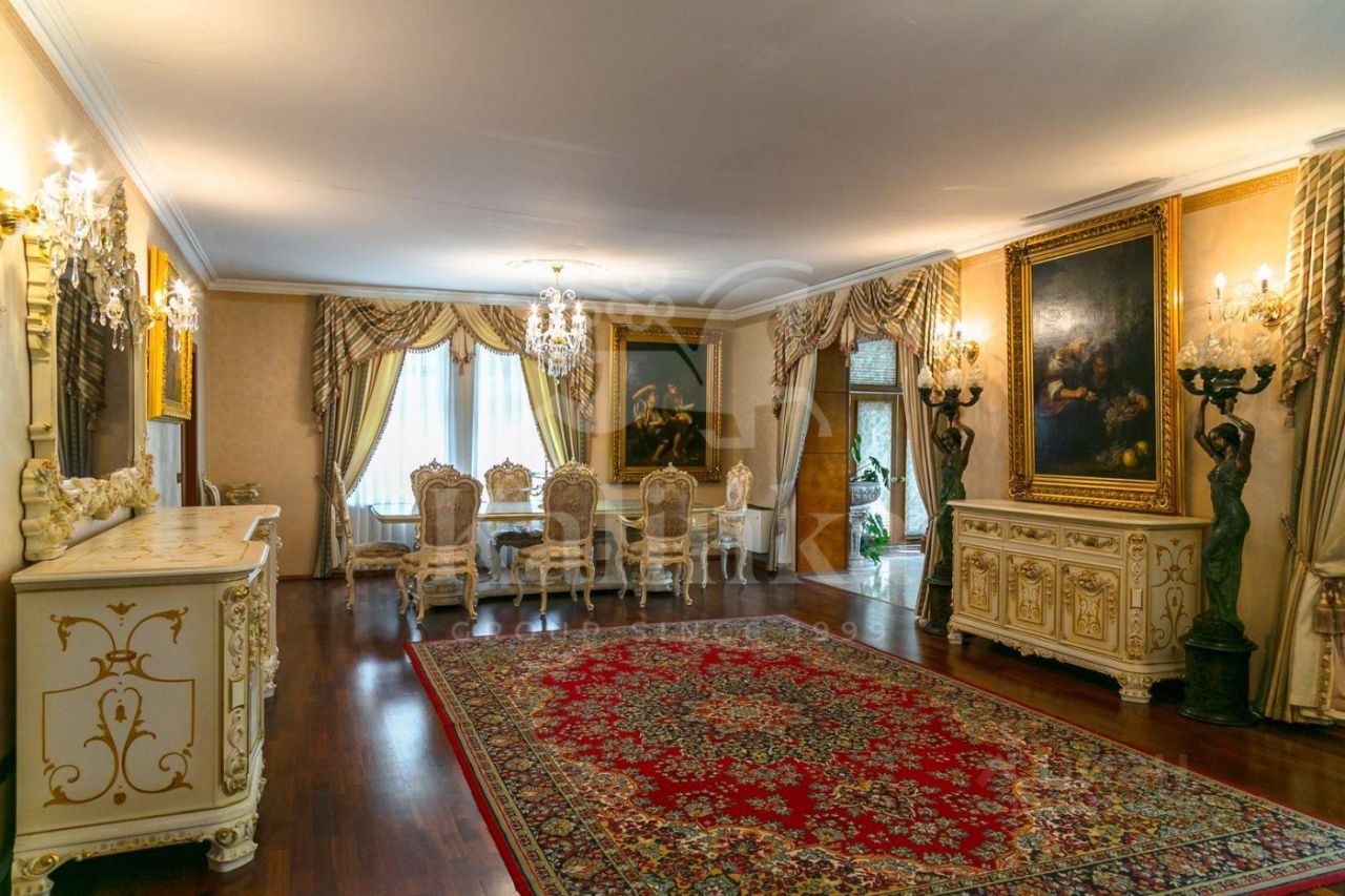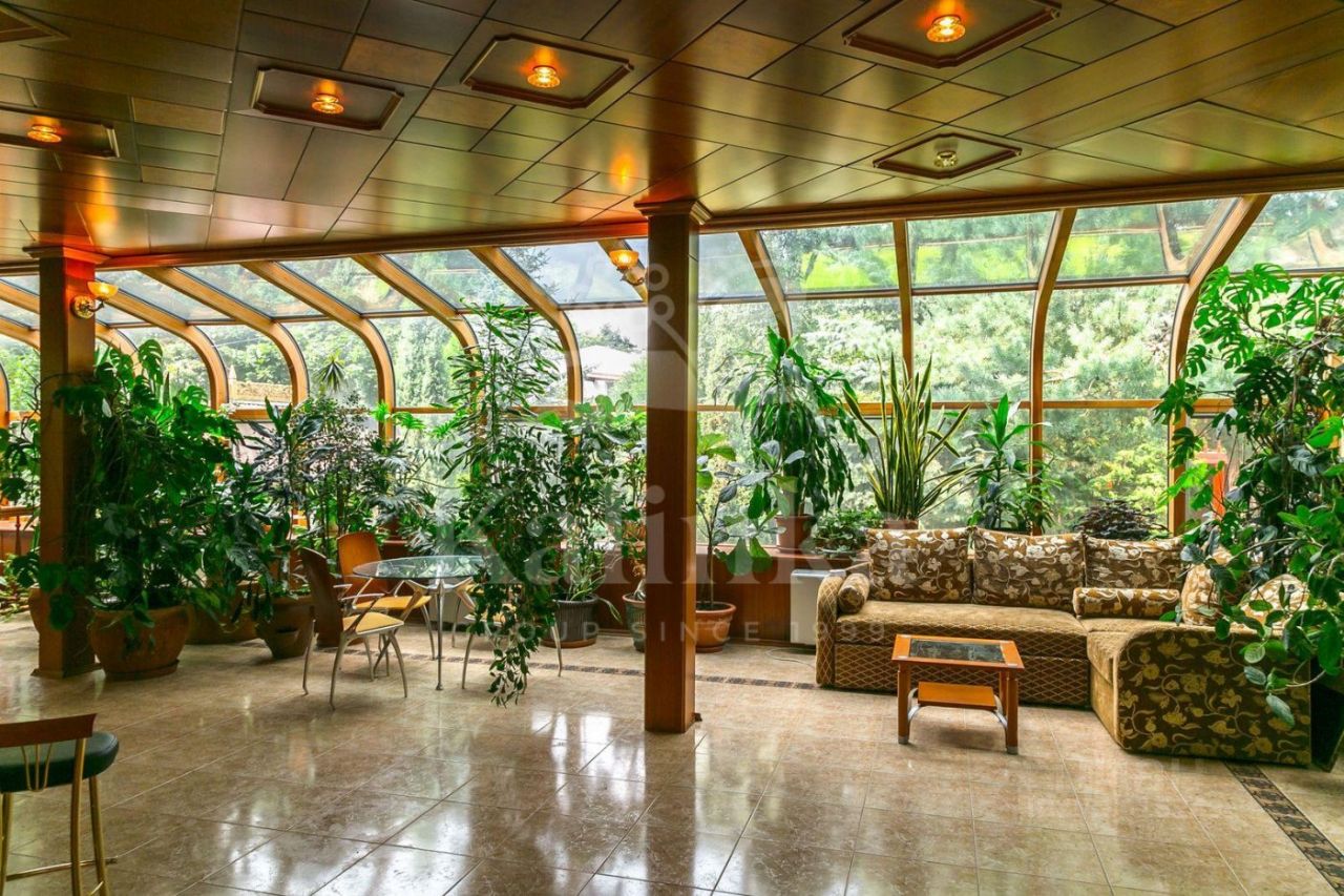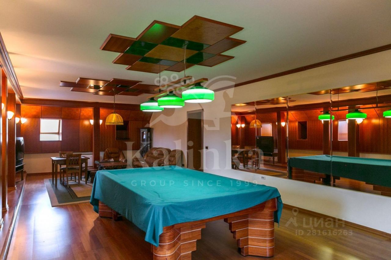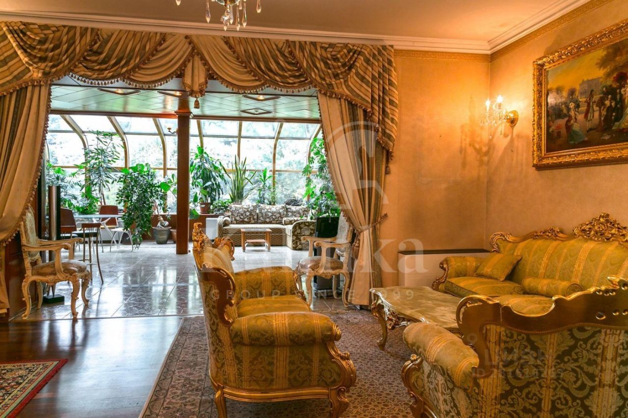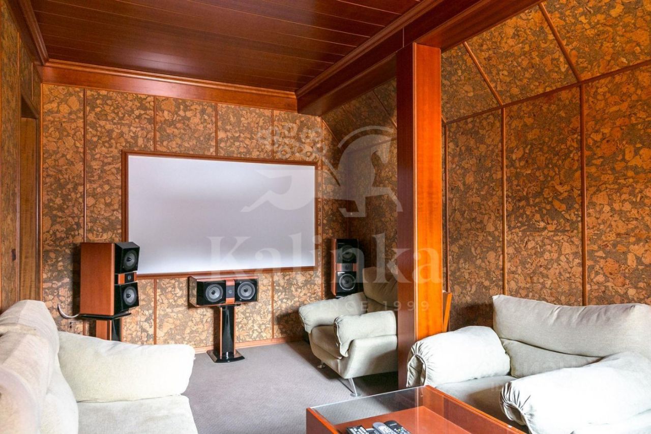 Планировка: цоколь: бассейн, сауна, спортзал, с/у, котельная, 1 этаж: прихожая, кухня, столовая, гостиная с камином, кабинет, с/у, зимний сад, 2 этаж: 3 спальни с с/у, зимний сад, мансарда: кинотеатр, бильярдная, спальня, с/у. На участке дом для персонала 100 кв.м. с гаражом на 2 м/м.