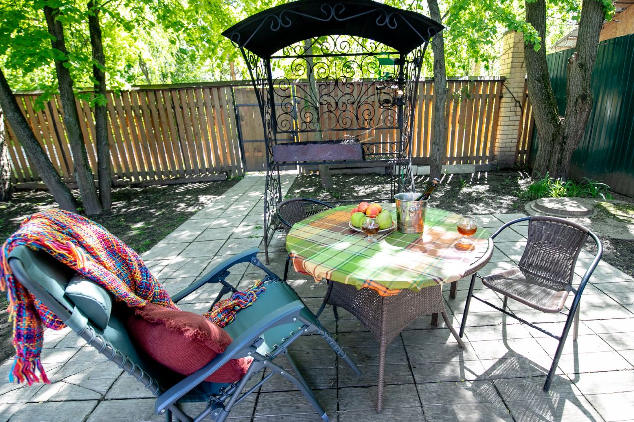 Зона барбекю с мангалами, казаном и уютным патио — мясо, шашлык и душевные посиделки гарантированы!