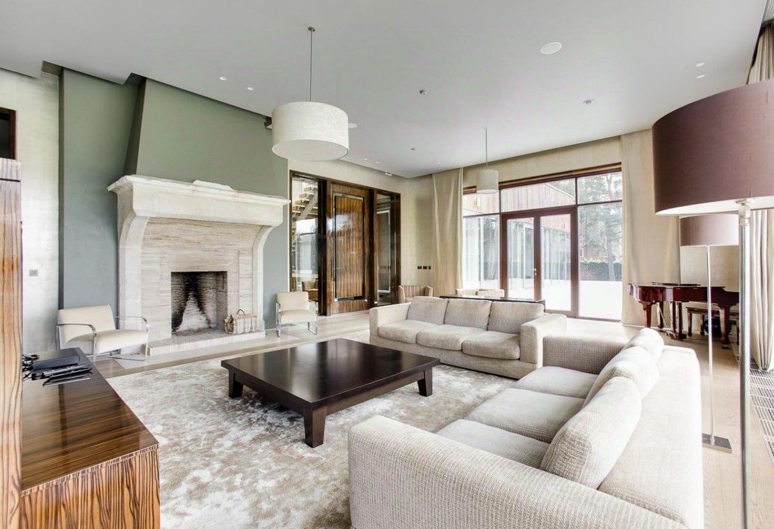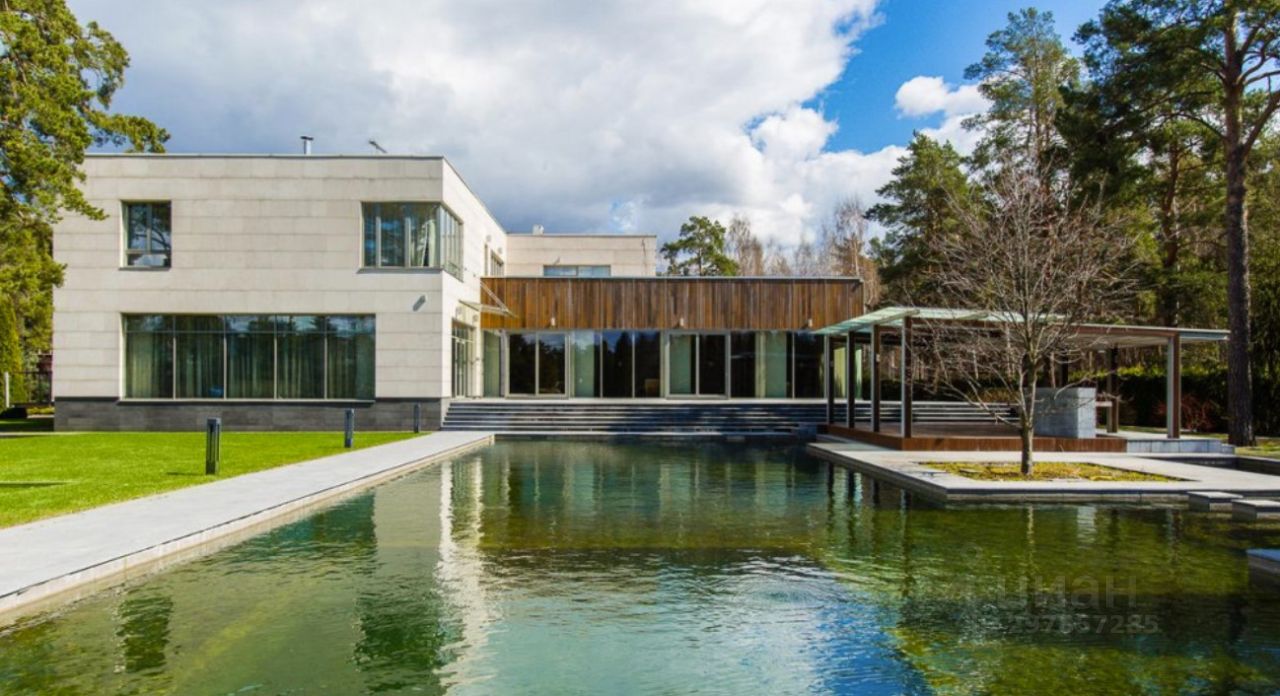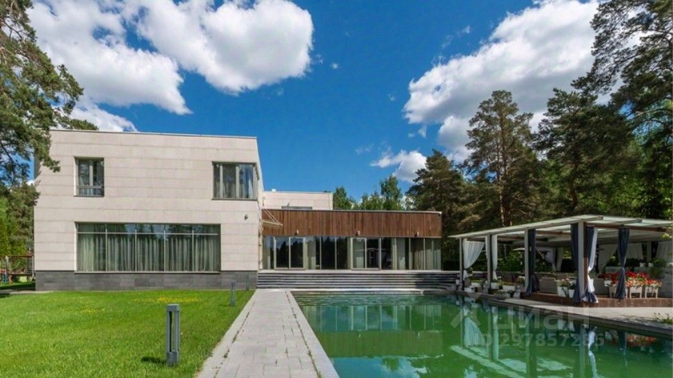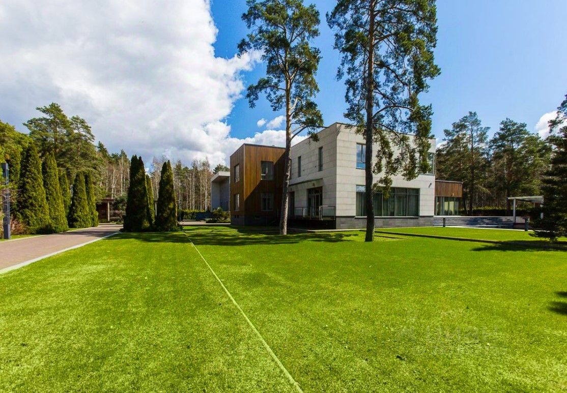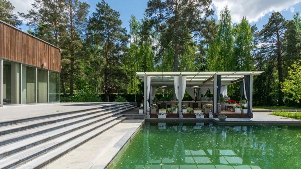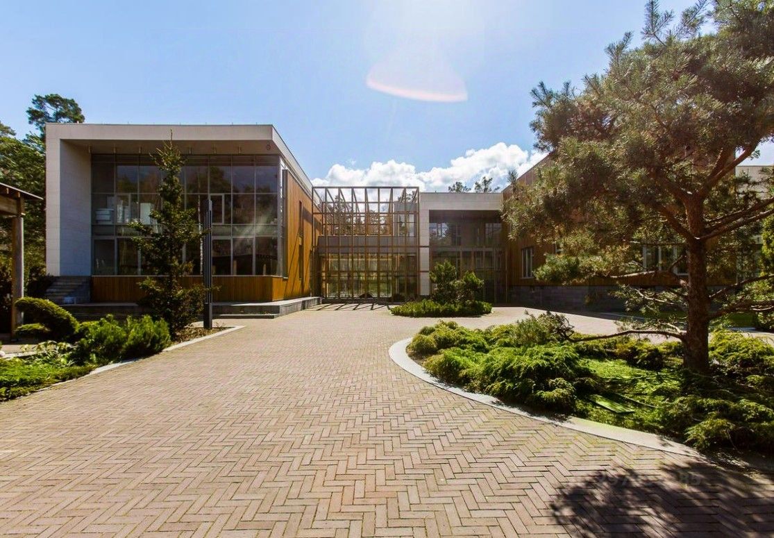 В цоколе расположился гараж с автоматическим распределением машин, домашний кинотеатр, котельная, технические помещения, постирочные, кладовые и (самое главное!) рабочая кухня, оборудованная холодильным помещением, плитами и вытяжкой. Установлена система ''умный дом'', дорогое инженерное оборудование. На участке есть место для проведения торжеств, растут вековые сосны. Отдельно располагается огромный гараж с комнатами для персонала на втором этаже. Также имеются еще один дом для персонала и при въезде на участок - дом для охраны.