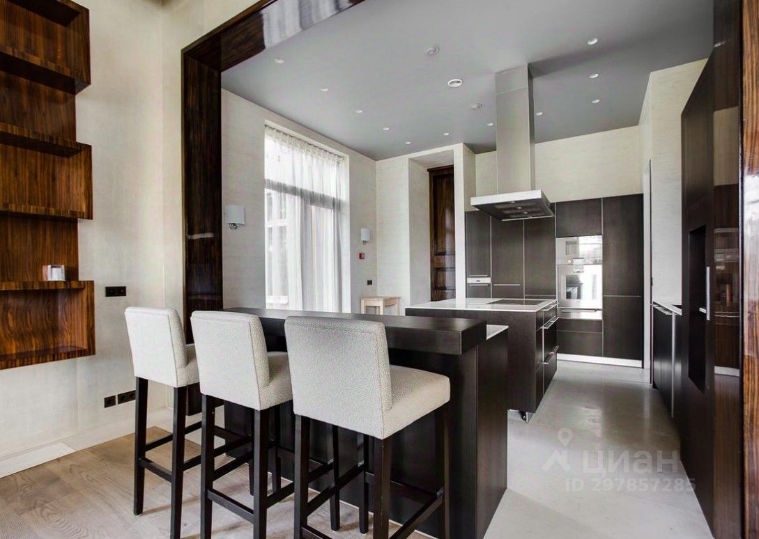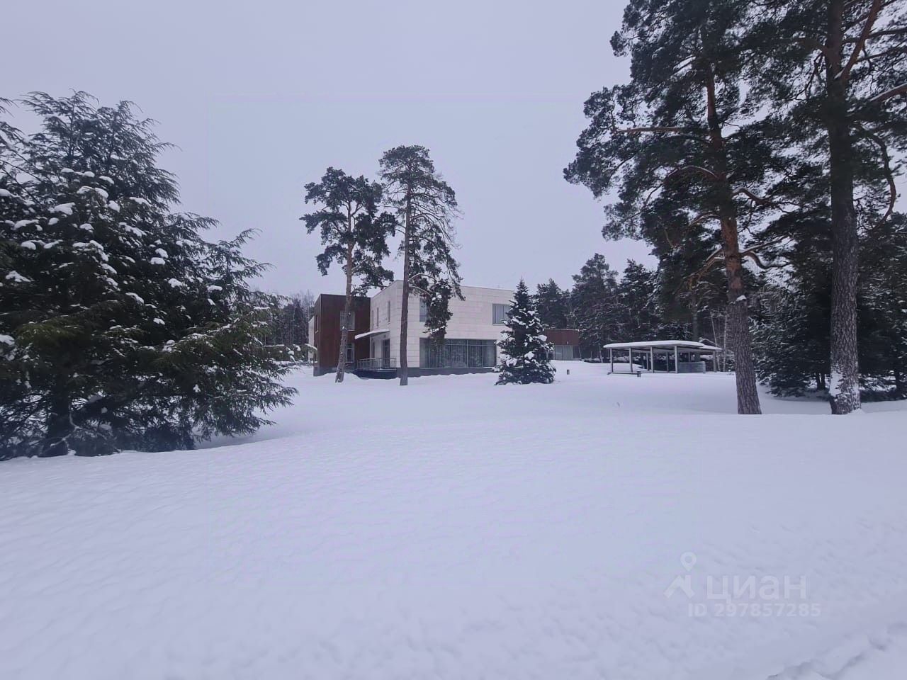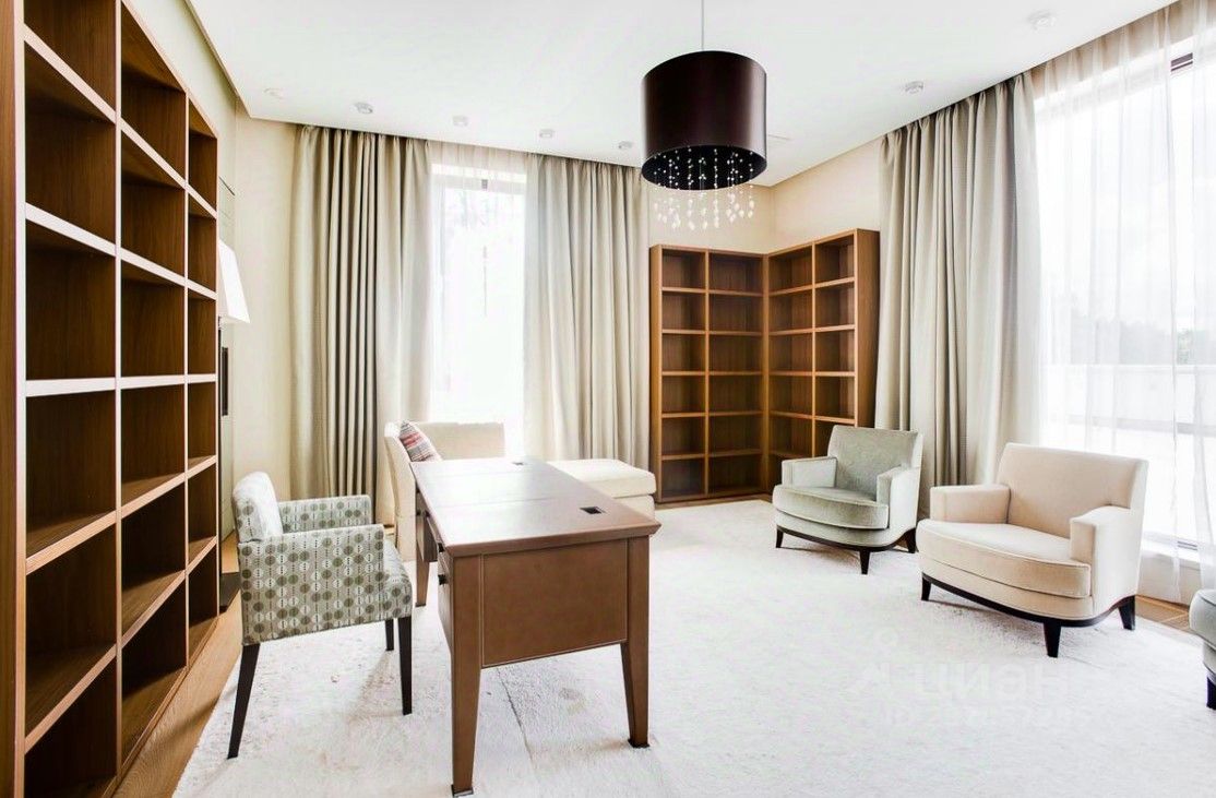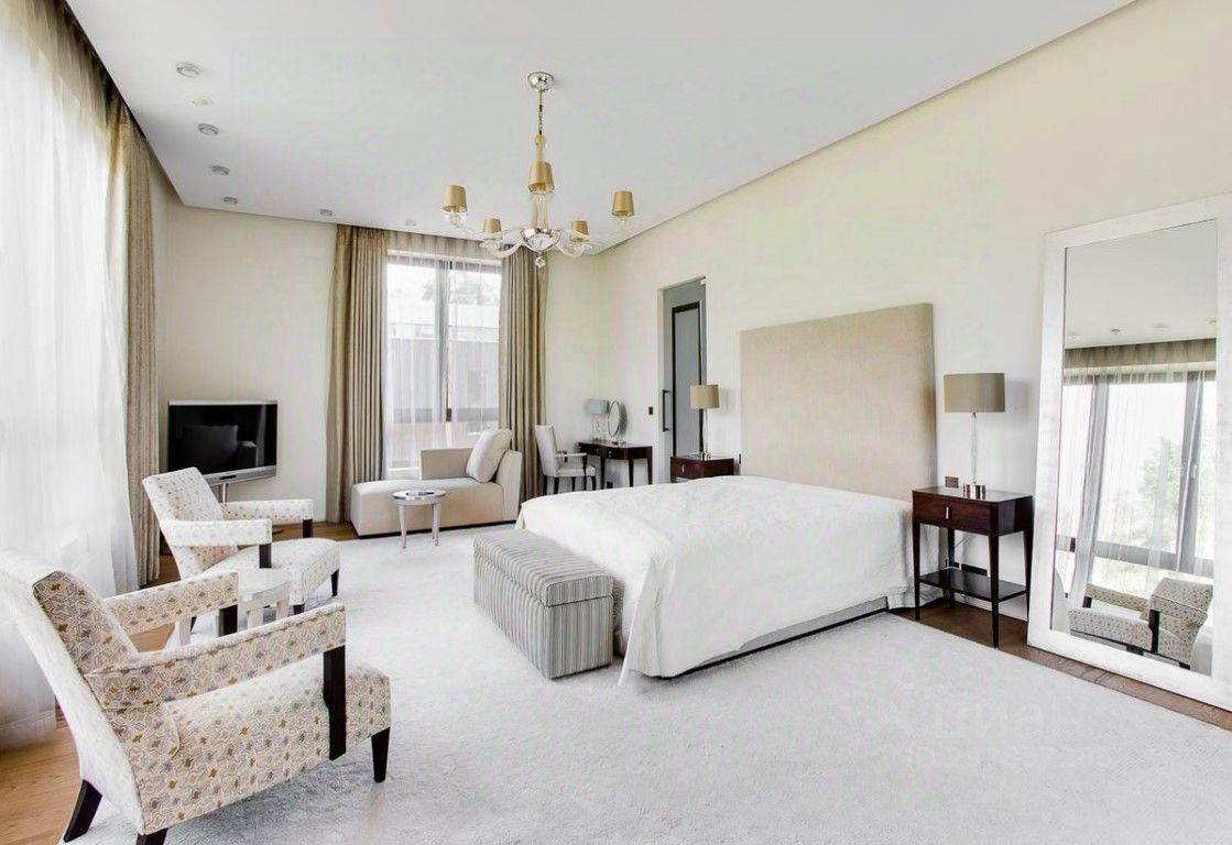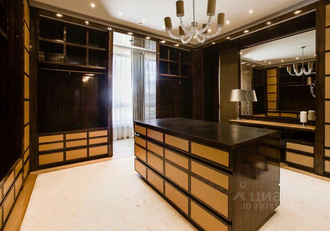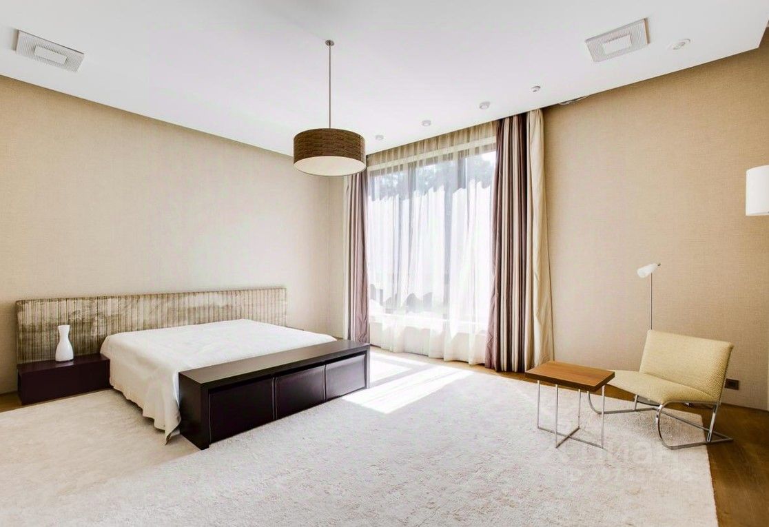 В цоколе расположился гараж с автоматическим распределением машин, домашний кинотеатр, котельная, технические помещения, постирочные, кладовые и (самое главное!) рабочая кухня, оборудованная холодильным помещением, плитами и вытяжкой. Установлена система ''умный дом'', дорогое инженерное оборудование. На участке есть место для проведения торжеств, растут вековые сосны. Отдельно располагается огромный гараж с комнатами для персонала на втором этаже. Также имеются еще один дом для персонала и при въезде на участок - дом для охраны.