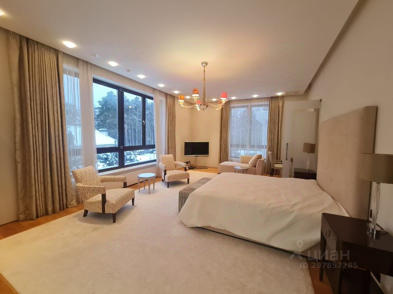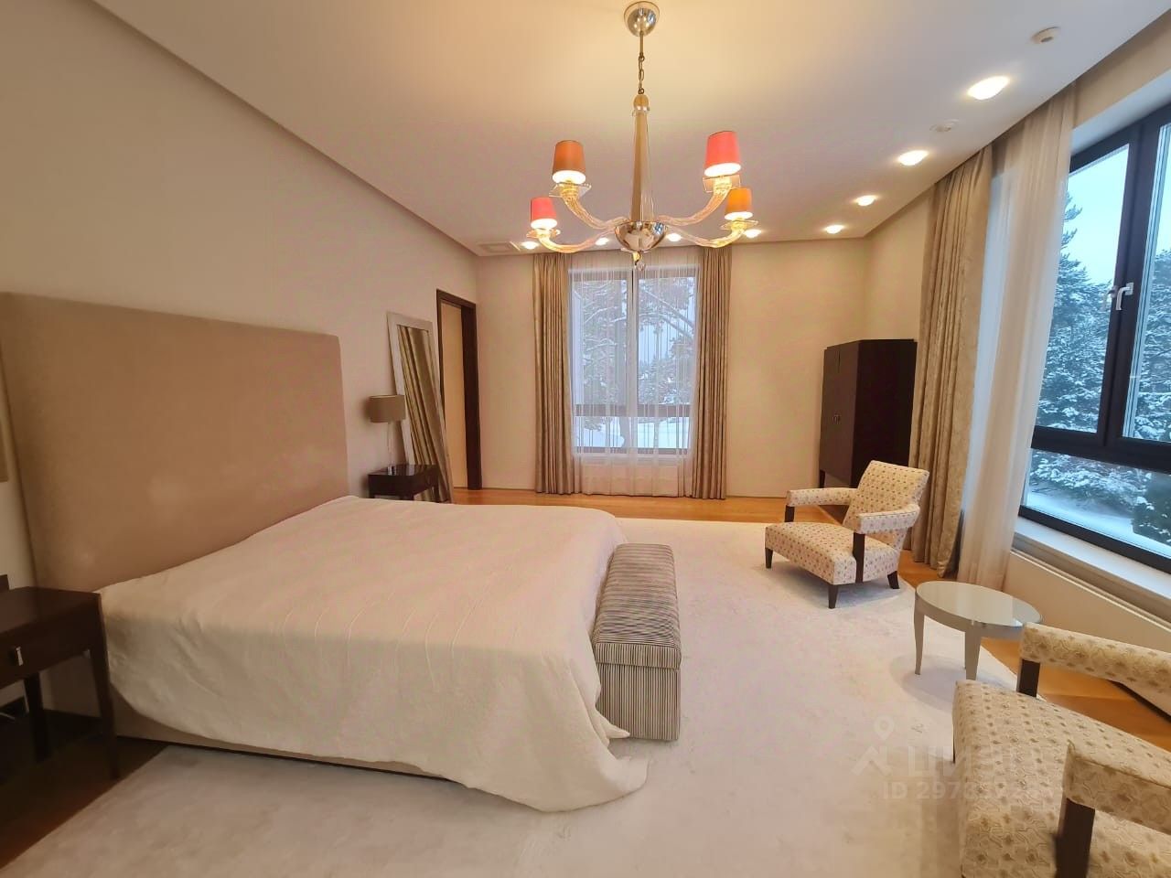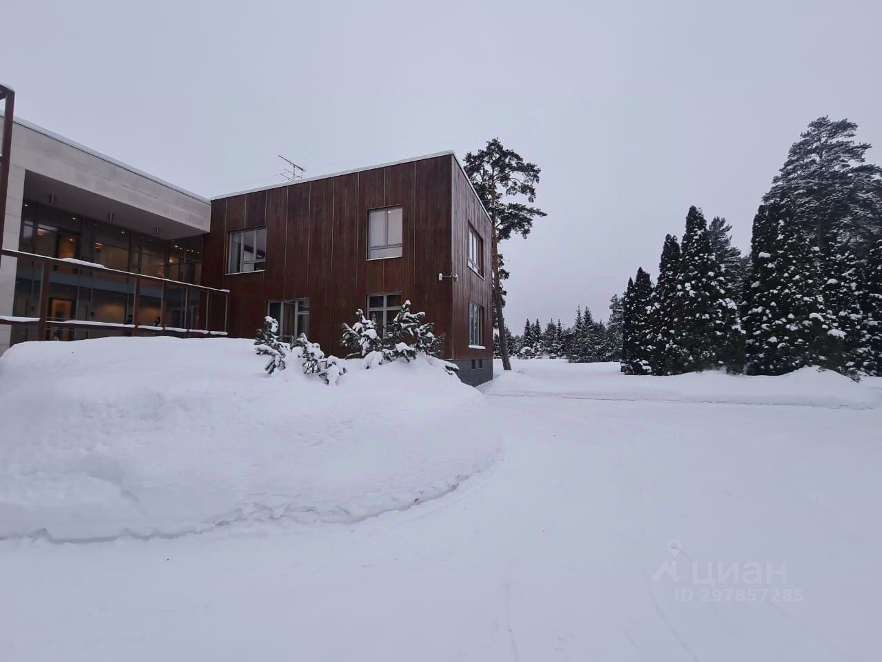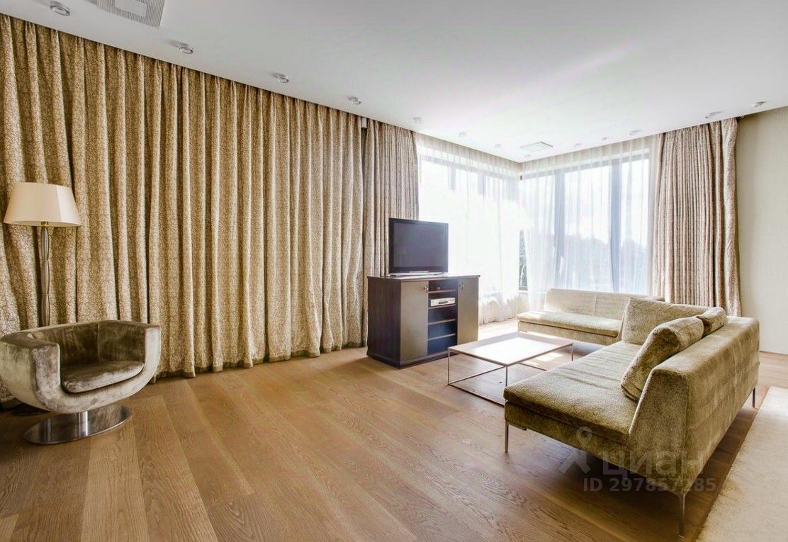 В цоколе расположился гараж с автоматическим распределением машин, домашний кинотеатр, котельная, технические помещения, постирочные, кладовые и (самое главное!) рабочая кухня, оборудованная холодильным помещением, плитами и вытяжкой. Установлена система ''умный дом'', дорогое инженерное оборудование. На участке есть место для проведения торжеств, растут вековые сосны. Отдельно располагается огромный гараж с комнатами для персонала на втором этаже. Также имеются еще один дом для персонала и при въезде на участок - дом для охраны.