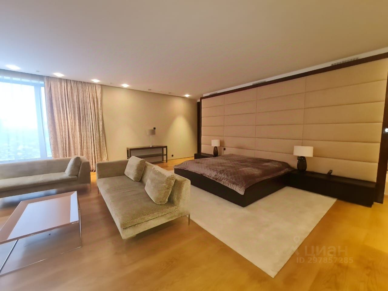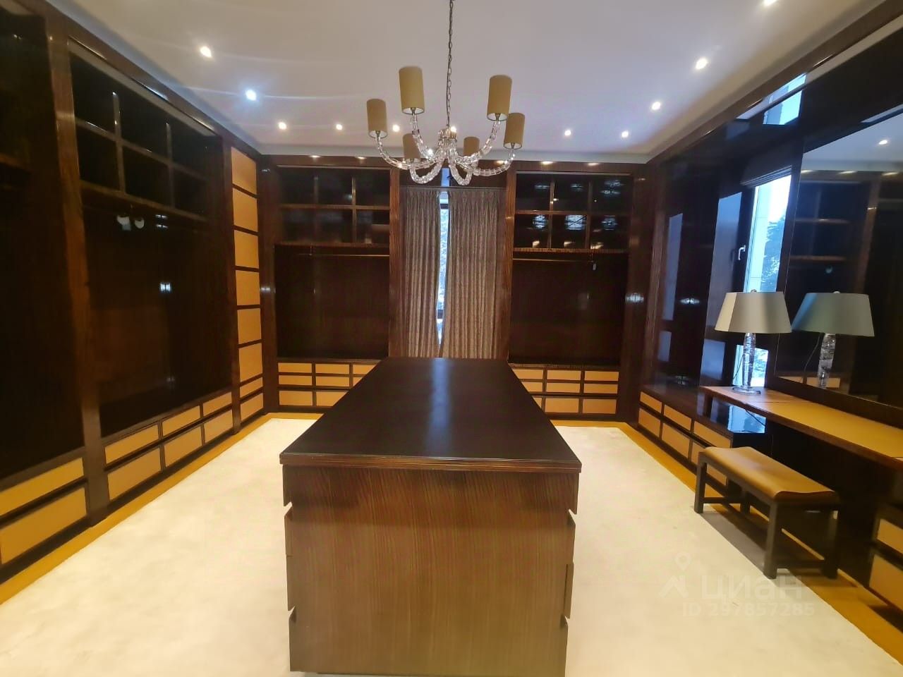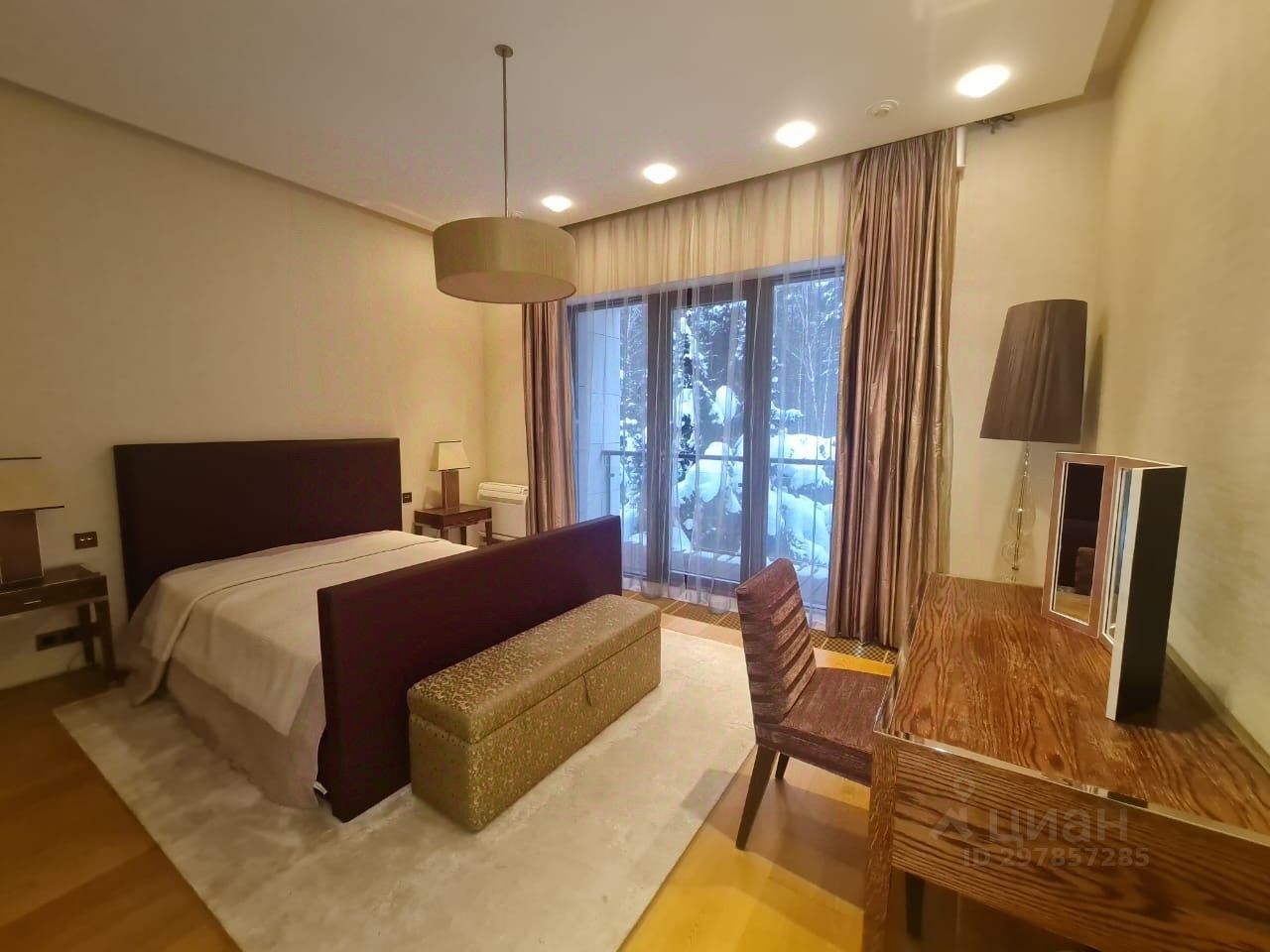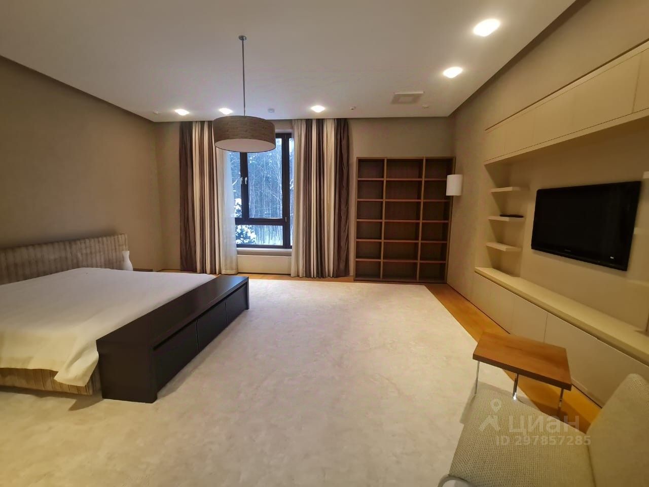 В цоколе расположился гараж с автоматическим распределением машин, домашний кинотеатр, котельная, технические помещения, постирочные, кладовые и (самое главное!) рабочая кухня, оборудованная холодильным помещением, плитами и вытяжкой. Установлена система ''умный дом'', дорогое инженерное оборудование. На участке есть место для проведения торжеств, растут вековые сосны. Отдельно располагается огромный гараж с комнатами для персонала на втором этаже. Также имеются еще один дом для персонала и при въезде на участок - дом для охраны.