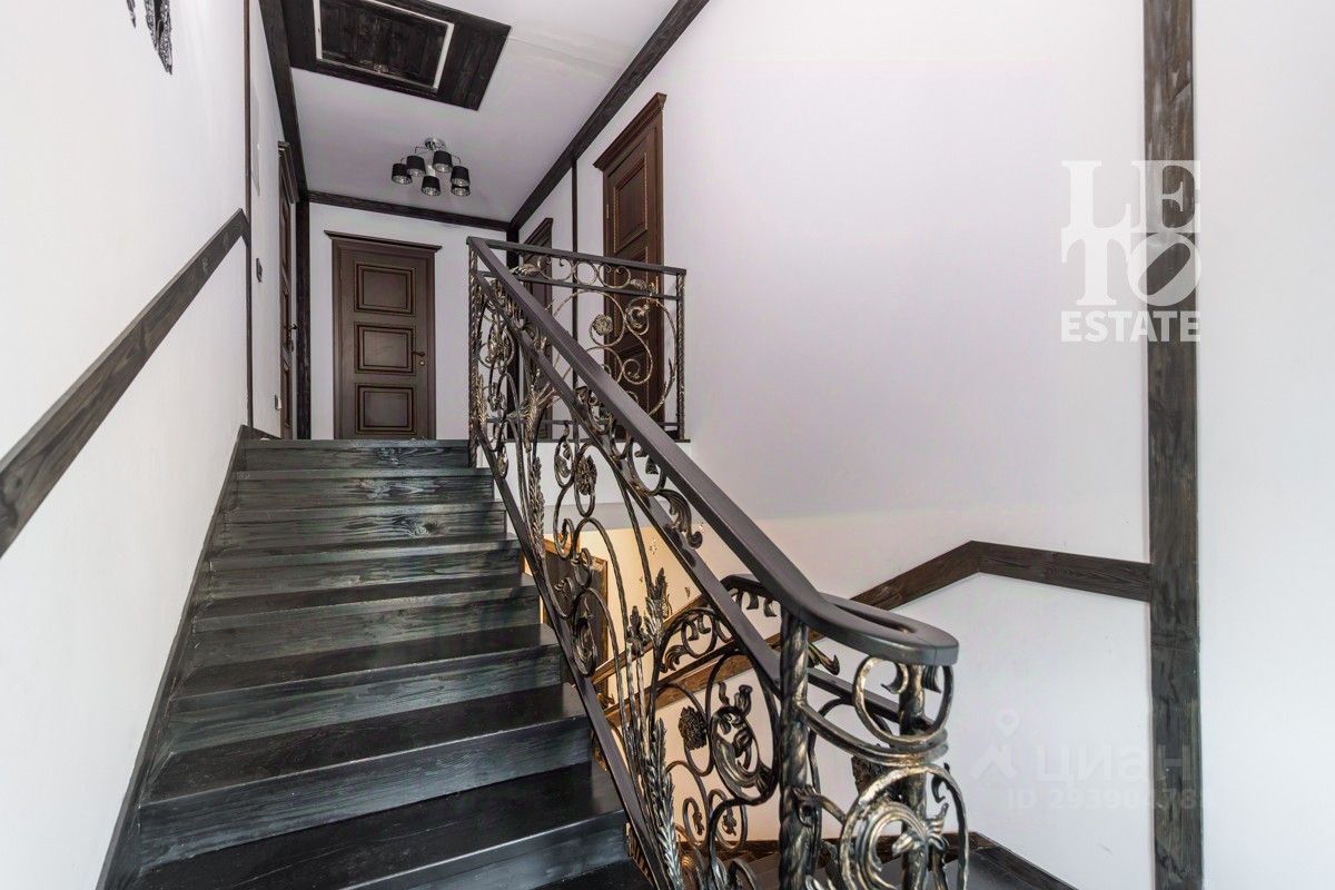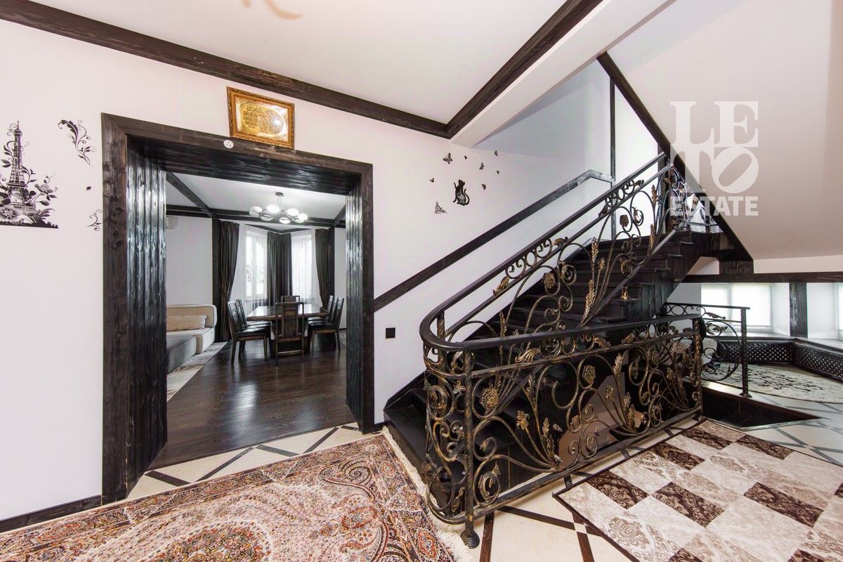 При входе в дом, нас встречает большая гостиная с вместительным столом для большой компании гостей. Далее по нашему пути, кухня-столовая со всей необходимой встроенной техникой производителей Bosch и Samsung. Подойдем к лестнице, которая ведет на второй и цокольный этажи, она сделана из натурального дерева с элементами ручной ковки. Поднимаемся по ней, и нас встречает спальня с индивидуальным дизайном.