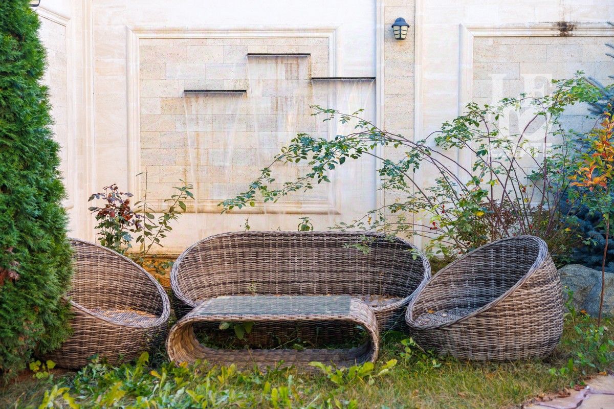Ландшафт участка уникален до мелочей. По периметру высажены туи, декоративные кустарники, а места для отдыха с фонтанами не оставят без впечатления даже самых исключительных ценителей.