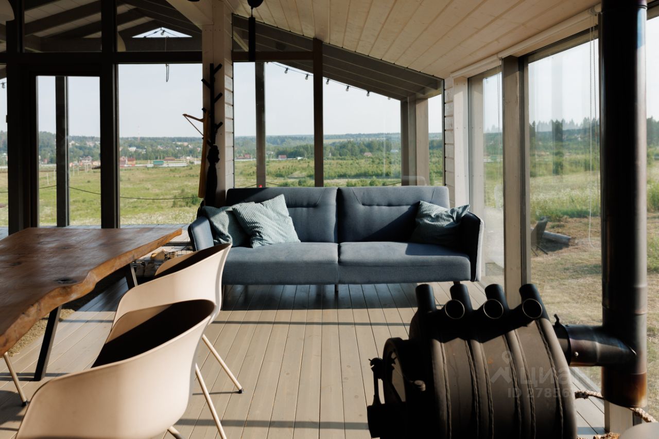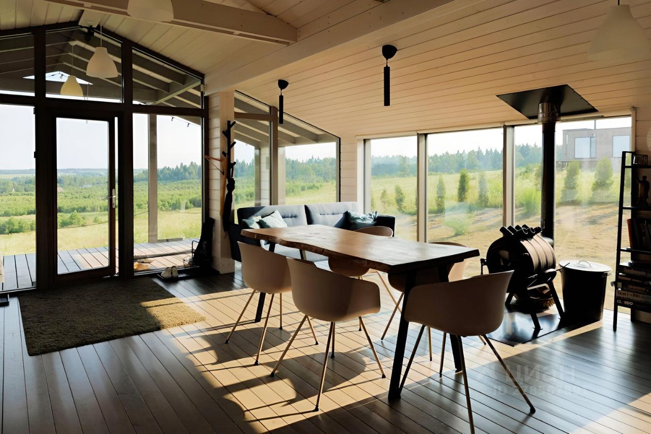 Современный дом с панорамными окнами и видом на просторы природы, с камином. Дубльдом кедр65. Уникальное расположение ДубльДома на склоне (перепад более 2 метров) позволяет круглый год наслаждаться видами ''в горизонт'' и на лес без каких-либо заборов. Поселок расположен в экологически чистой природной зоне - в заказнике Москворечье. Формат поселка без заборов позволяет гулять по нему с видами на лес и дома. Сам посёлок огорожен, въезд по пропускам.
