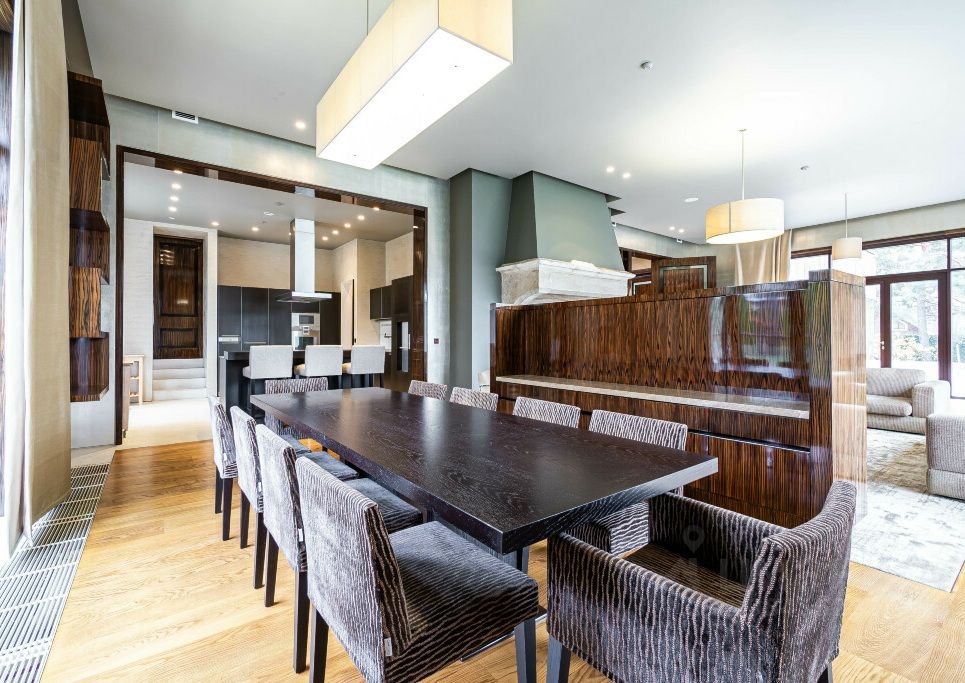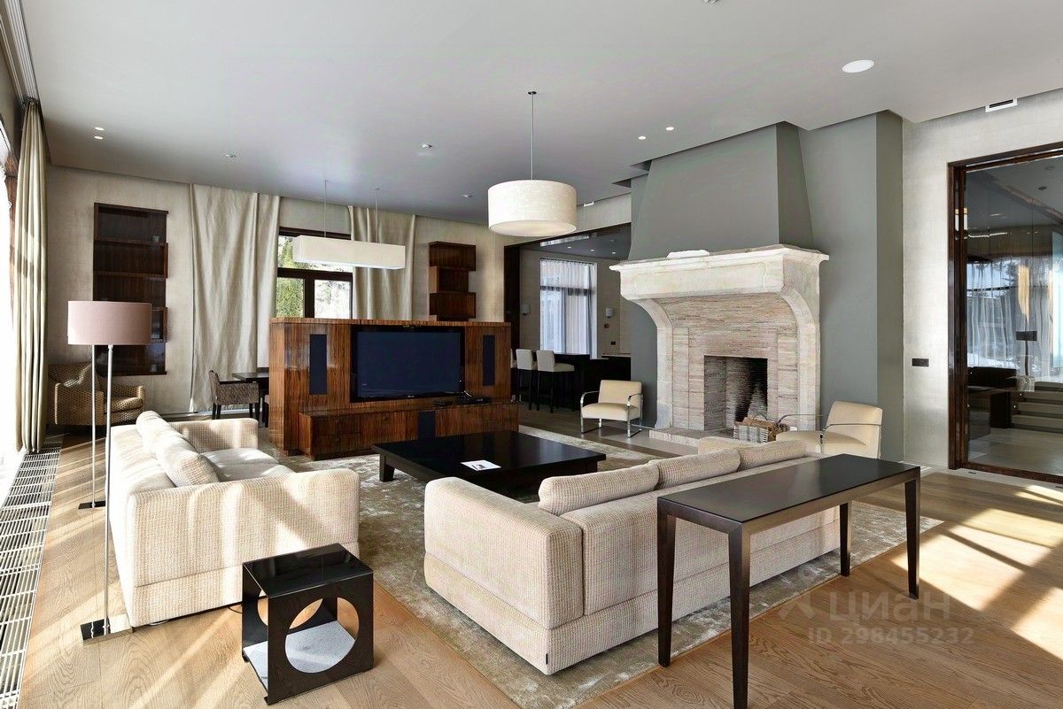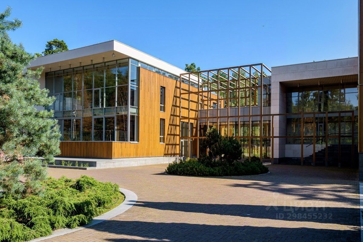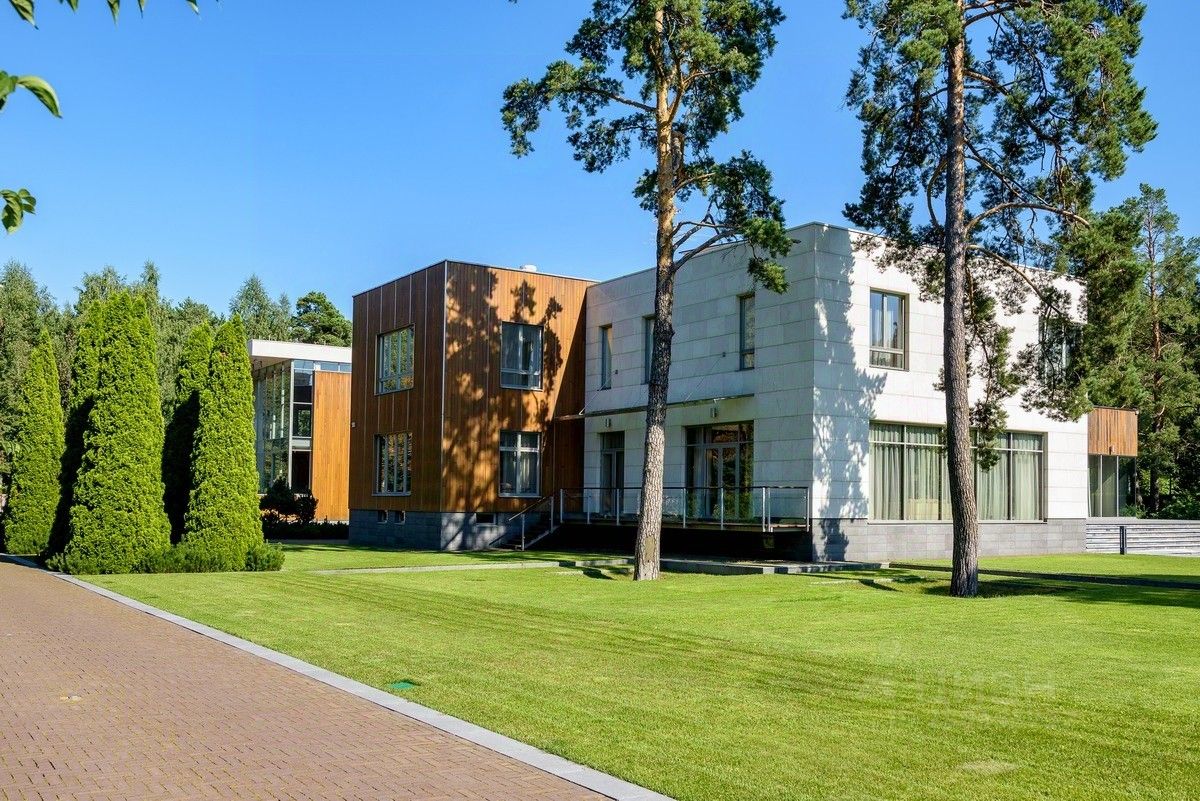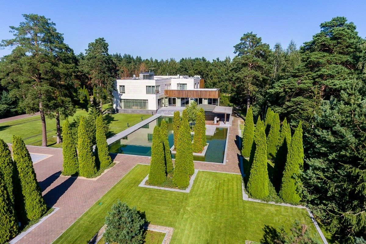 Просторная загородная резиденция площадью 2200 кв.м. расположена на участке 113 соток. Фасад в современном стиле облицован под натуральный камень и дерево. В доме спланировали 8 спален, гостиную с камином и выходом на террасу, кабинет с камином, домашний кинотеатр, SPA-зону с бассейном, хаммамом, джакузи и массажной комнатой, залы для спорта и йоги, оружейную комнату и винный погреб. На территории расположен гараж на 10 машин с квартирой для персонала (5 спален) и блоком для водителя, дом для охраны, большой пруд с зоной барбекю.