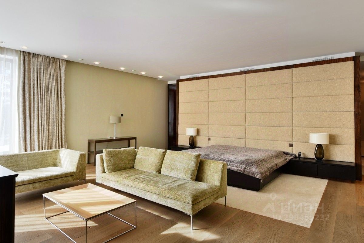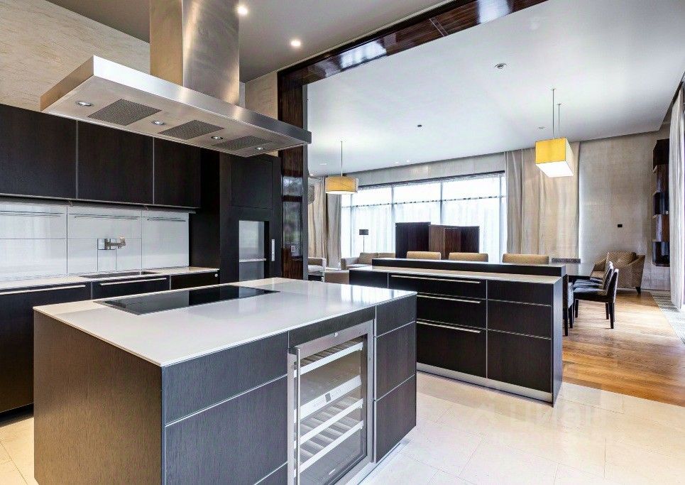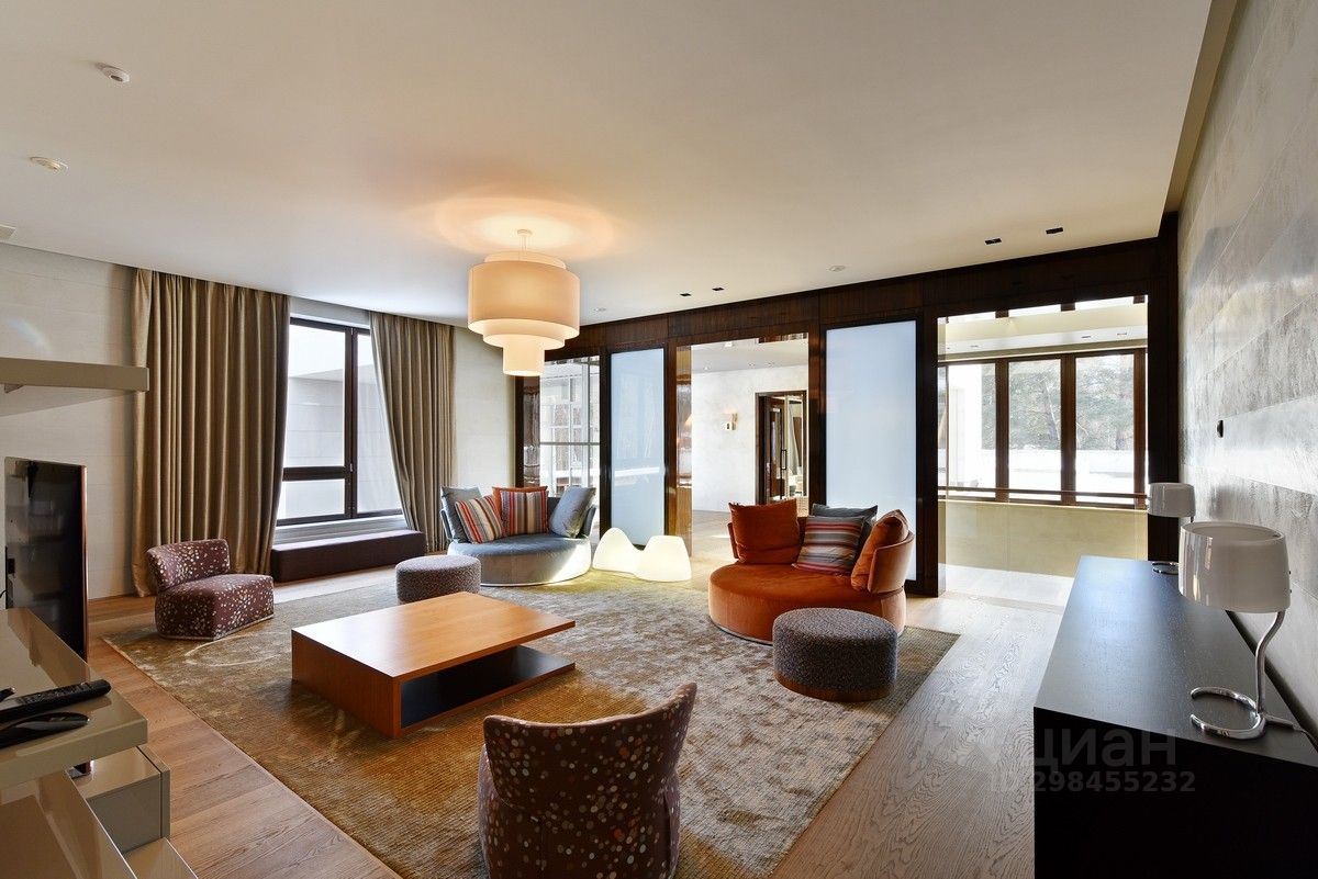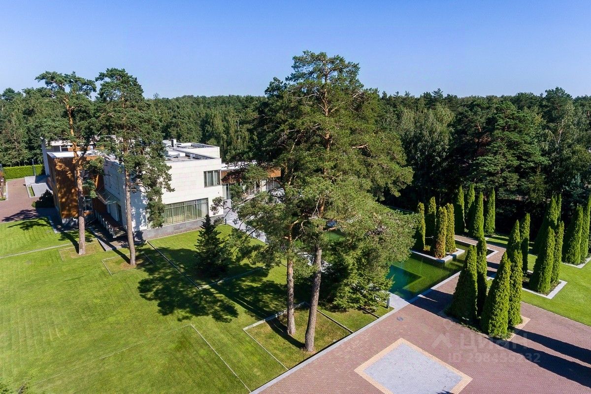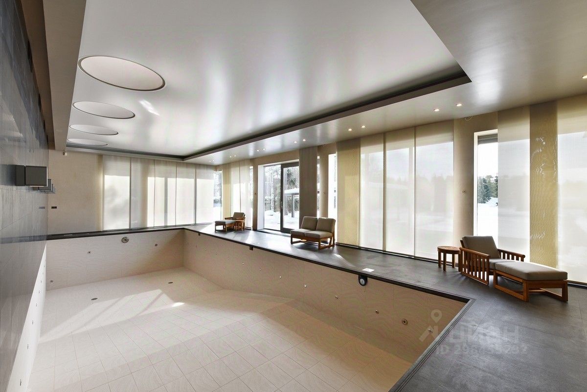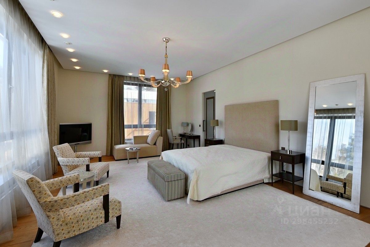 Просторная загородная резиденция площадью 2200 кв.м. расположена на участке 113 соток. Фасад в современном стиле облицован под натуральный камень и дерево. В доме спланировали 8 спален, гостиную с камином и выходом на террасу, кабинет с камином, домашний кинотеатр, SPA-зону с бассейном, хаммамом, джакузи и массажной комнатой, залы для спорта и йоги, оружейную комнату и винный погреб. На территории расположен гараж на 10 машин с квартирой для персонала (5 спален) и блоком для водителя, дом для охраны, большой пруд с зоной барбекю.