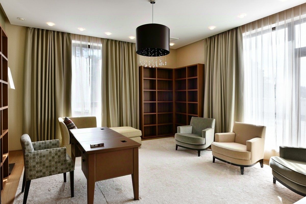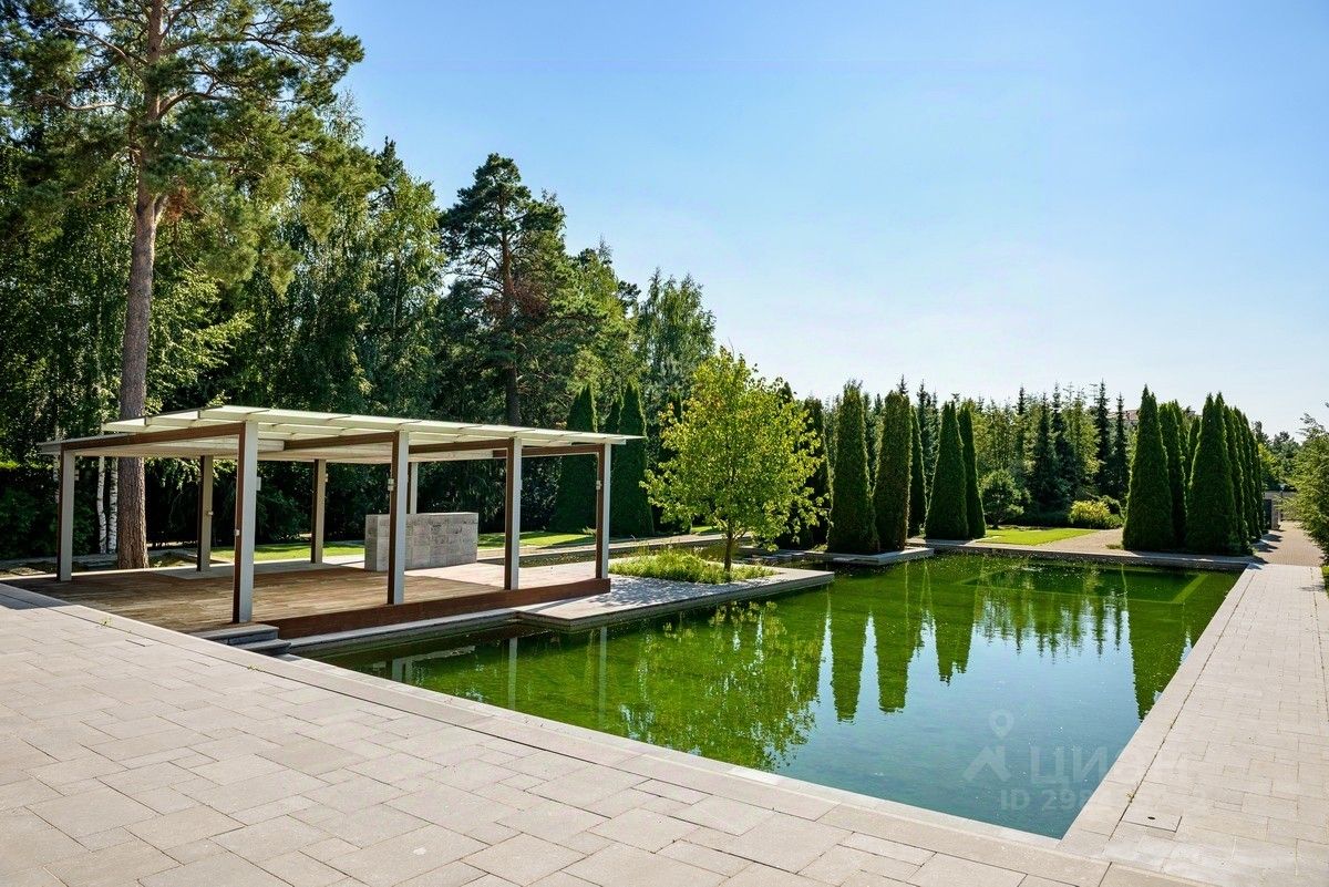 Просторная загородная резиденция площадью 2200 кв.м. расположена на участке 113 соток. Фасад в современном стиле облицован под натуральный камень и дерево. В доме спланировали 8 спален, гостиную с камином и выходом на террасу, кабинет с камином, домашний кинотеатр, SPA-зону с бассейном, хаммамом, джакузи и массажной комнатой, залы для спорта и йоги, оружейную комнату и винный погреб. На территории расположен гараж на 10 машин с квартирой для персонала (5 спален) и блоком для водителя, дом для охраны, большой пруд с зоной барбекю. На участке выполнен ландшафтный дизайн, обустроен маленький пруд с японским садом, водопад.