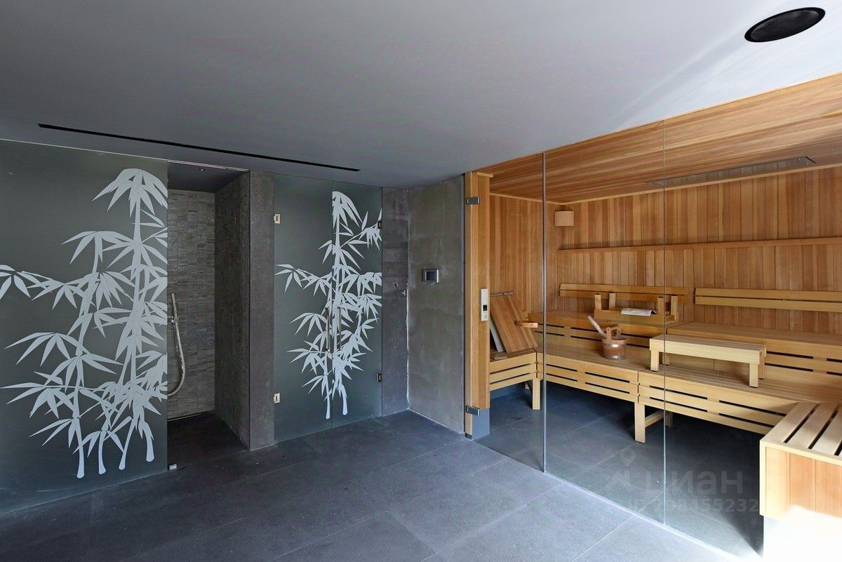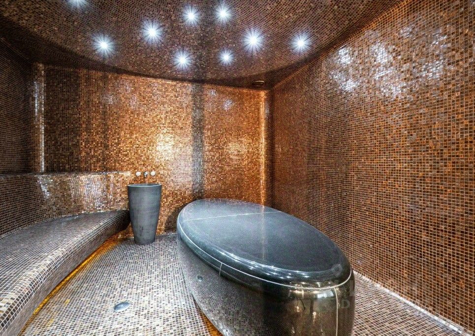 1-й этаж: холл, гардеробная, гостевой с/у, спальня с с/у и гардеробной комнатой, кухня, большой кабинет с каминной зоной и выходом на террасу, гостиная, хаммам, массажная, с/у, 2 бассейна, терраса.