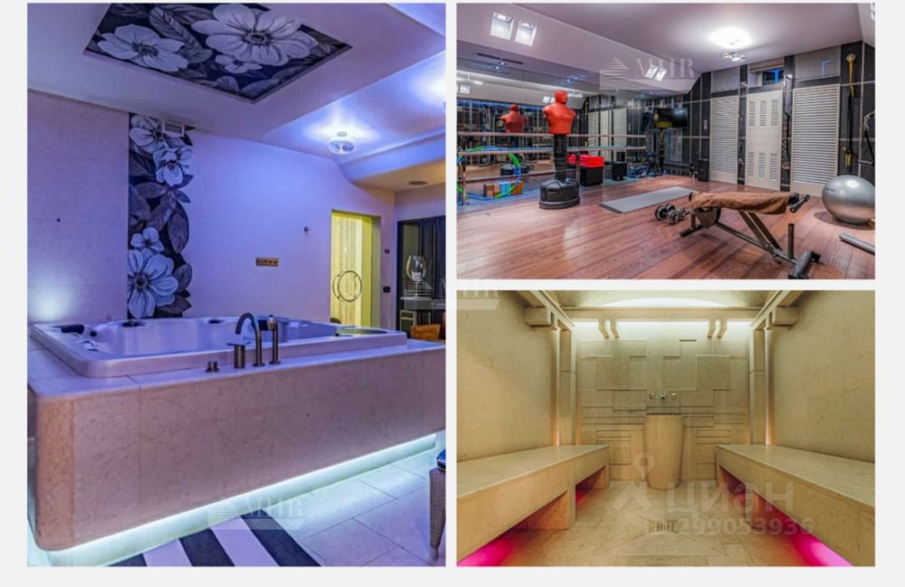 Цоколь: тренажерный зал, хаммам, массажный кабинет, душевая, с/у, джакузи, постирочная, подземный переход во флигель. 1 этаж: холл, две гардеробные комнаты, с/у, кухня-гостиная с камином, второй свет, гостевой блок с собственной каминной, спальней и с/у. 2 этаж: 4 спальни с с/у и гардеробными.