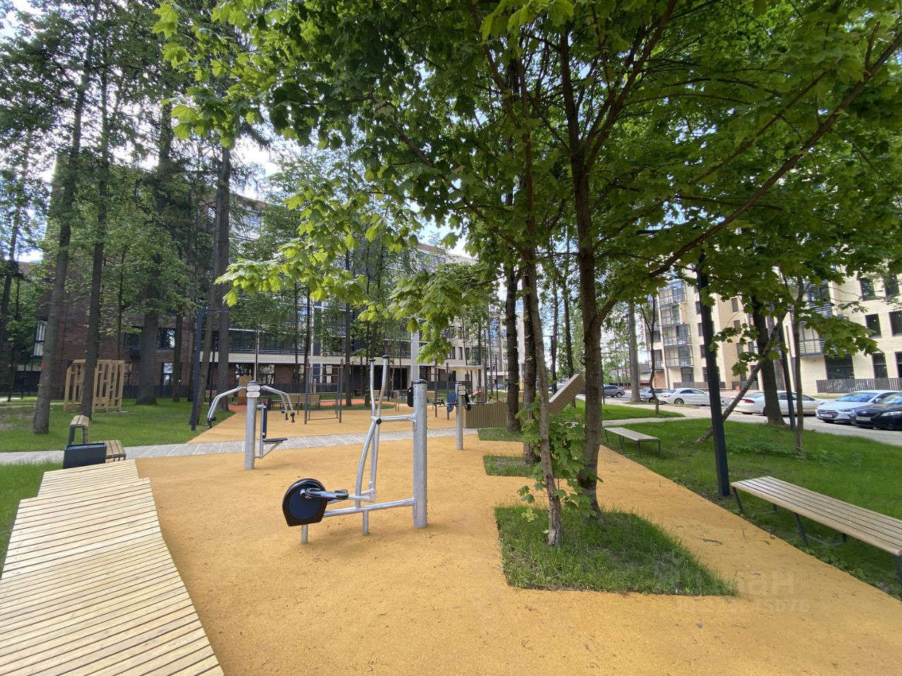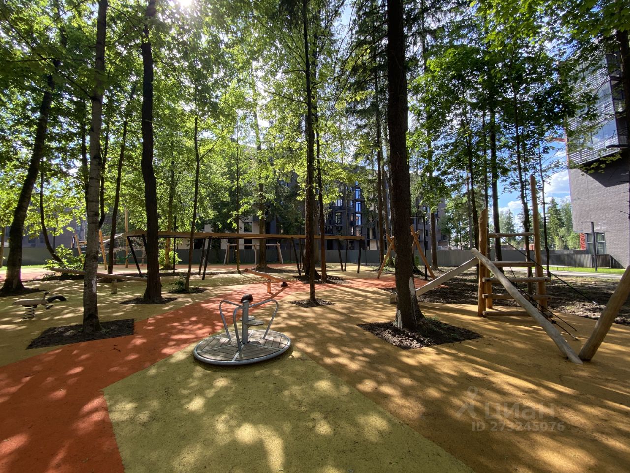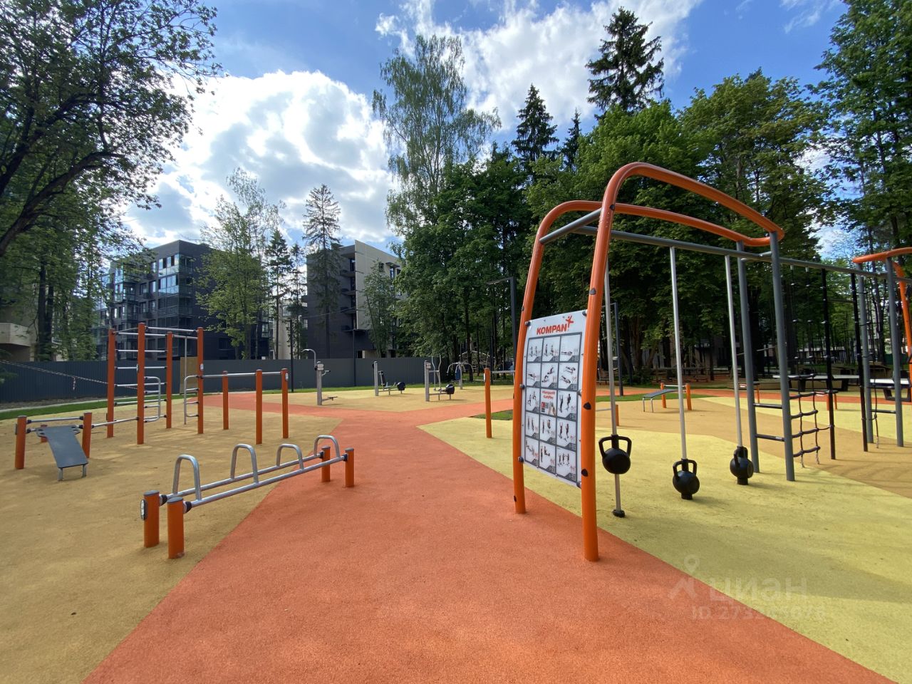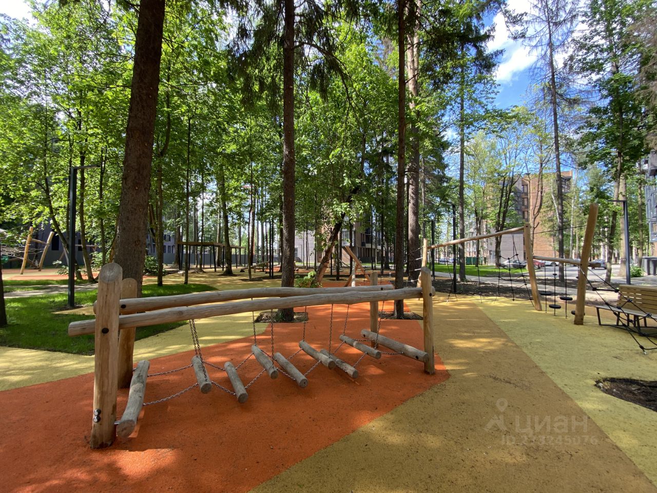 Лесная территория поселка с 6-этажными домами, благоустроенными детскими и спортивными площадками, скверами и зонами отдыха.