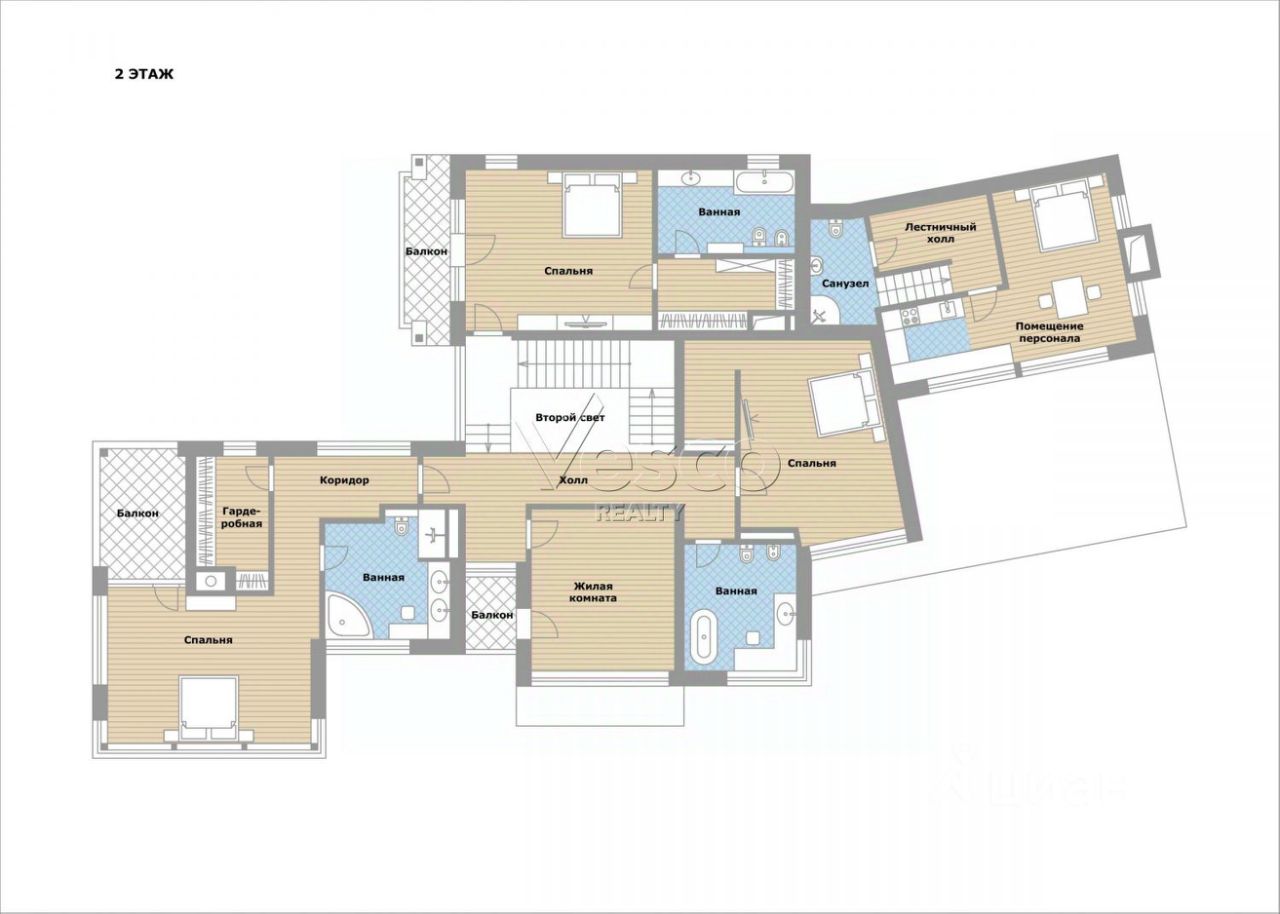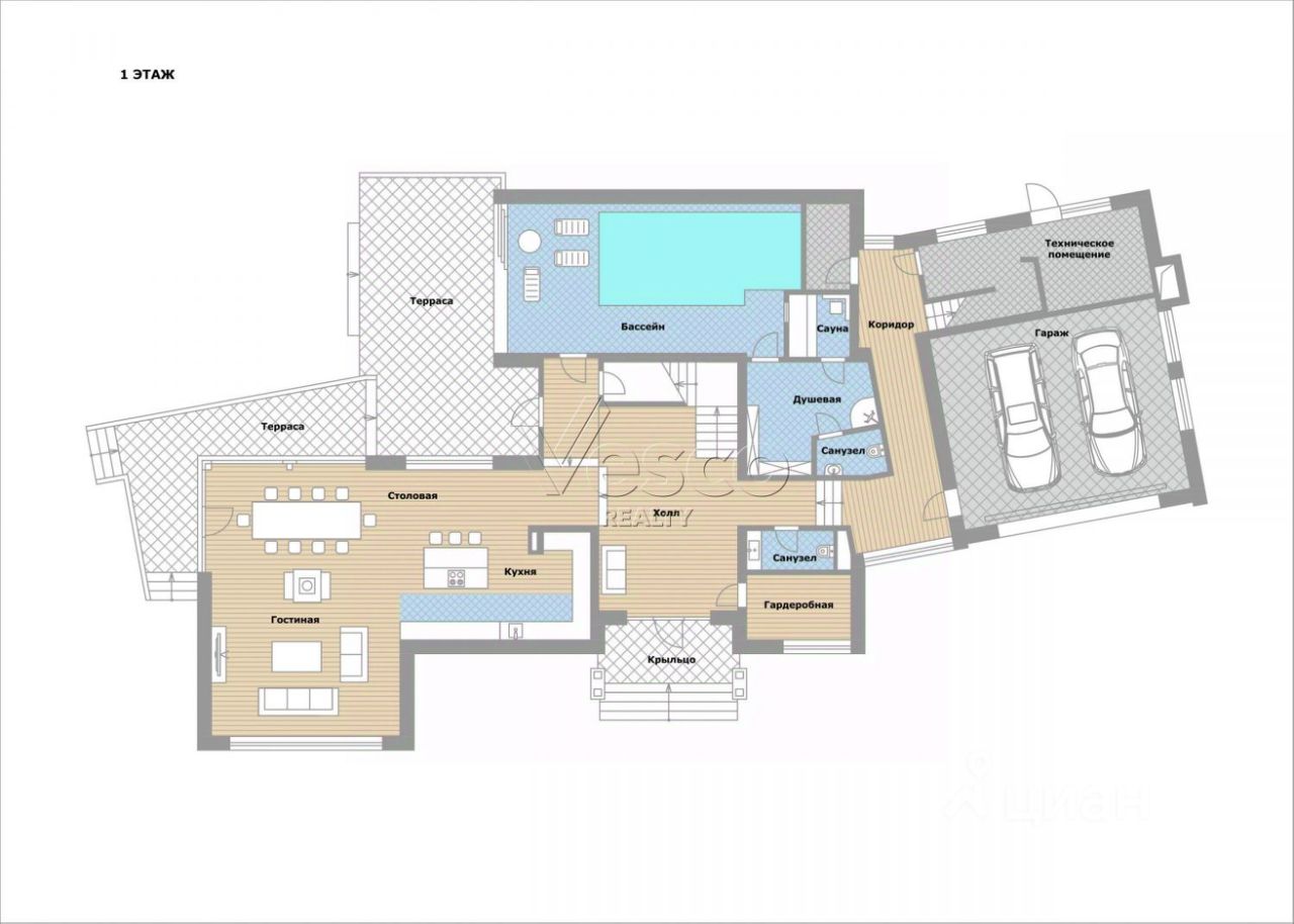 1 этаж: кухня-гостиная со сквозным камином и панорамным остеклением, гараж на 2 автомобиля, бассейн с противотоком 7 метров, сауна, терраса открытая с бассейном всесезонная, два санузла и гардеробная, технические помещения (постилочная, котельная). 2 этаж: 3 спальни + кабинет (можно переделать в спальню) с индивидуальными гардеробными и санузлами, 4-я спальня с отдельной лестницей и своей кухней (может использоваться как блок для персонала, гостевой блок, и т.д).