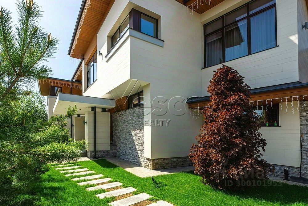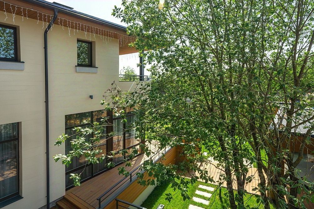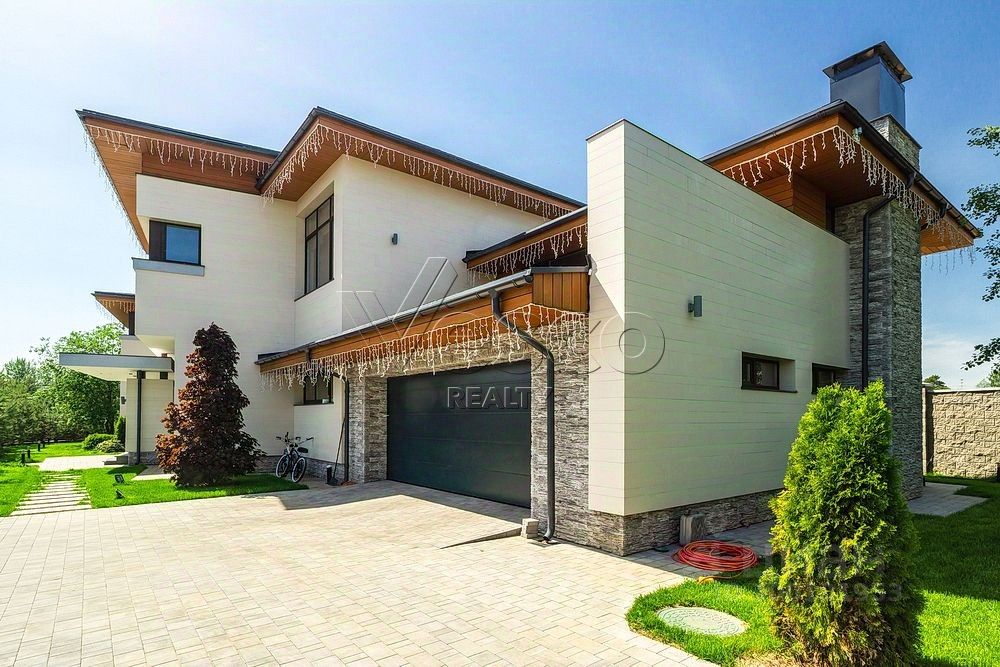 На участке выполнено ландшафтное озеленение (сосны, ели, красные канадские клены, каштаны, и т. д.). Элитный рулонный газон, автополив, дорожки, освещение участка, фасадная подсветка, новогодняя подсветка.
