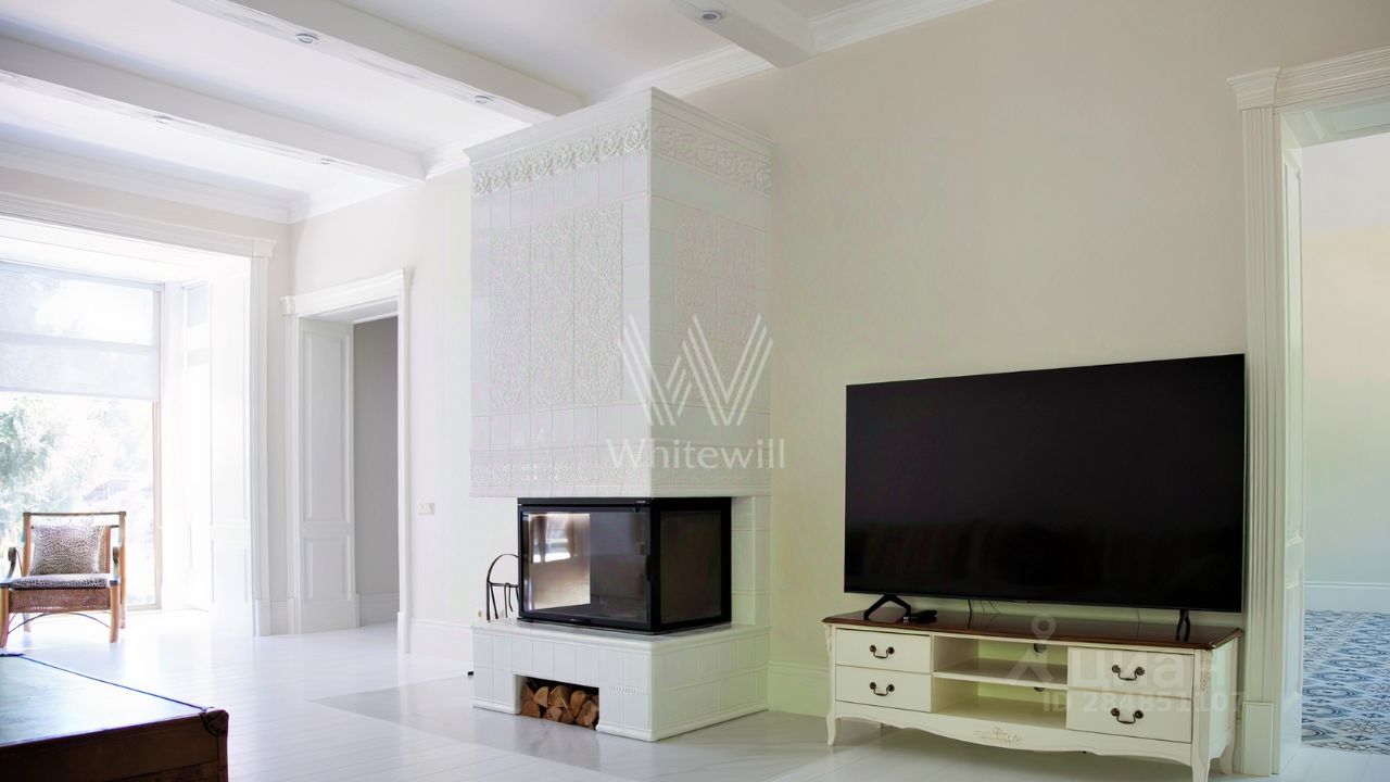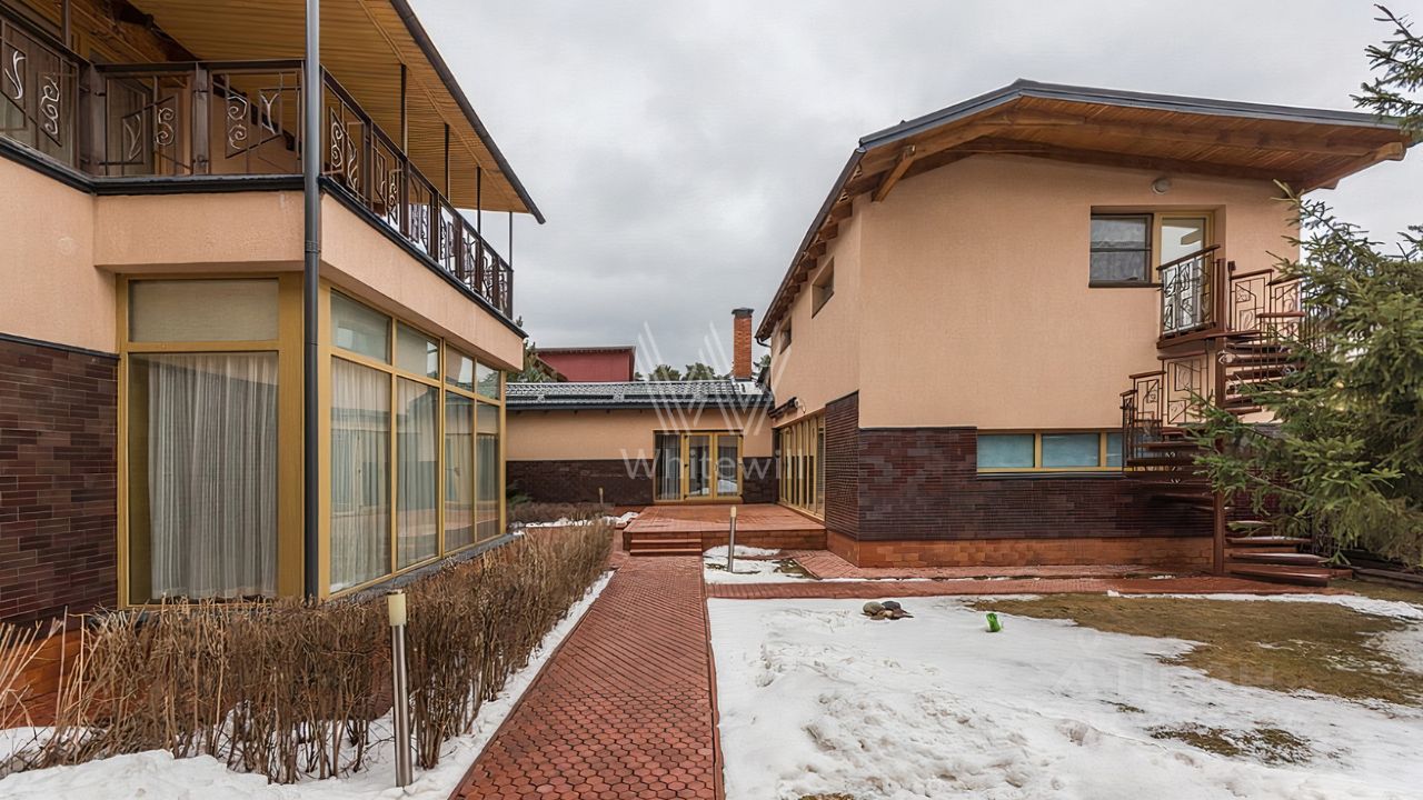 ID 11 276. Ольгино. Загородный дом площадью 450 м² расположен на полевом участке 25 соток. Фасад облицован бежевой штукатуркой и коричневой клинкерной плиткой. Светлый интерьер оформлен в теплых тонах, создающих атмосферу уюта. В резиденции разместили 5 спален, гостиную с камином, кухню, столовую, кабинет, игровую комнату и сауну. На участке с ландшафтным дизайном расположены SPA-комплекс с бассейном и комнатой отдыха и гараж на 2 машины с квартирой для персонала на втором этаже.