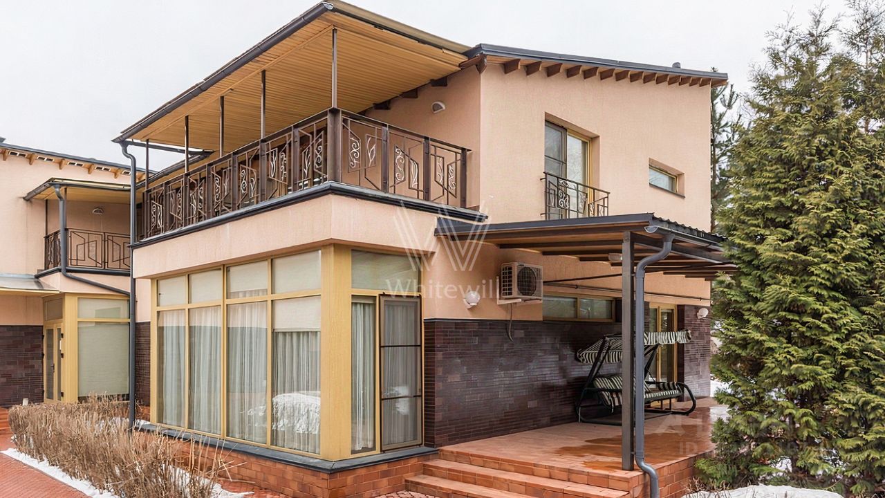 ID 11 276. Ольгино. Загородный дом площадью 450 м² расположен на полевом участке 25 соток. Фасад облицован бежевой штукатуркой и коричневой клинкерной плиткой. Светлый интерьер оформлен в теплых тонах, создающих атмосферу уюта. В резиденции разместили 5 спален, гостиную с камином, кухню, столовую, кабинет, игровую комнату и сауну. На участке с ландшафтным дизайном расположены SPA-комплекс с бассейном и комнатой отдыха и гараж на 2 машины с квартирой для персонала на втором этаже.
