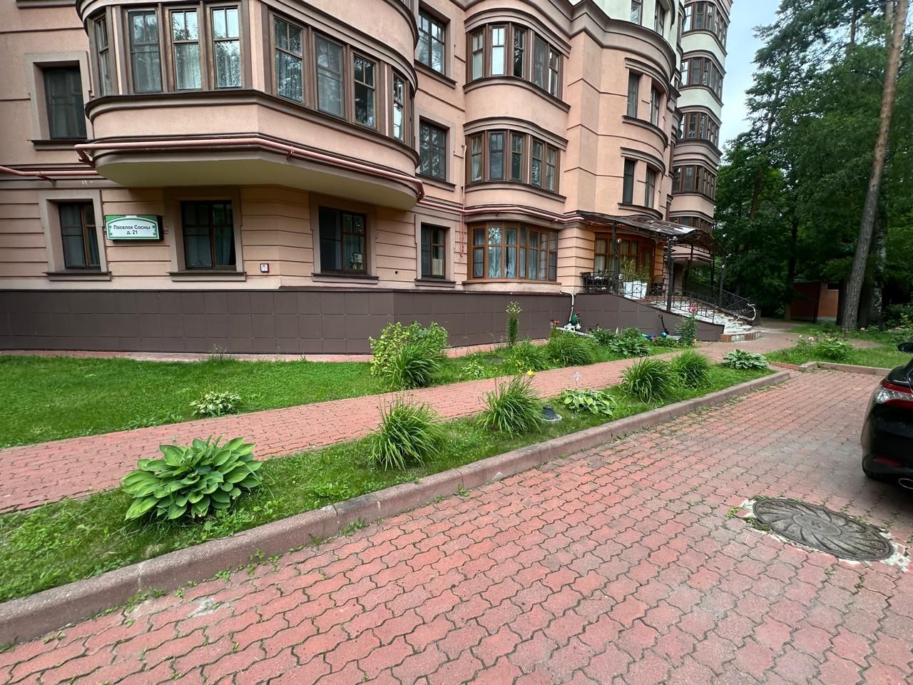 Квартира расположена на высоком 1 этаже 8 этажного здания в стиле неоклассицизма, вполне городской многоквартирный дом в окружении вековых сосновых лесов. Вход в квартиру возможен как с подъезда так и с улицы.
