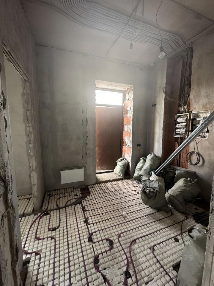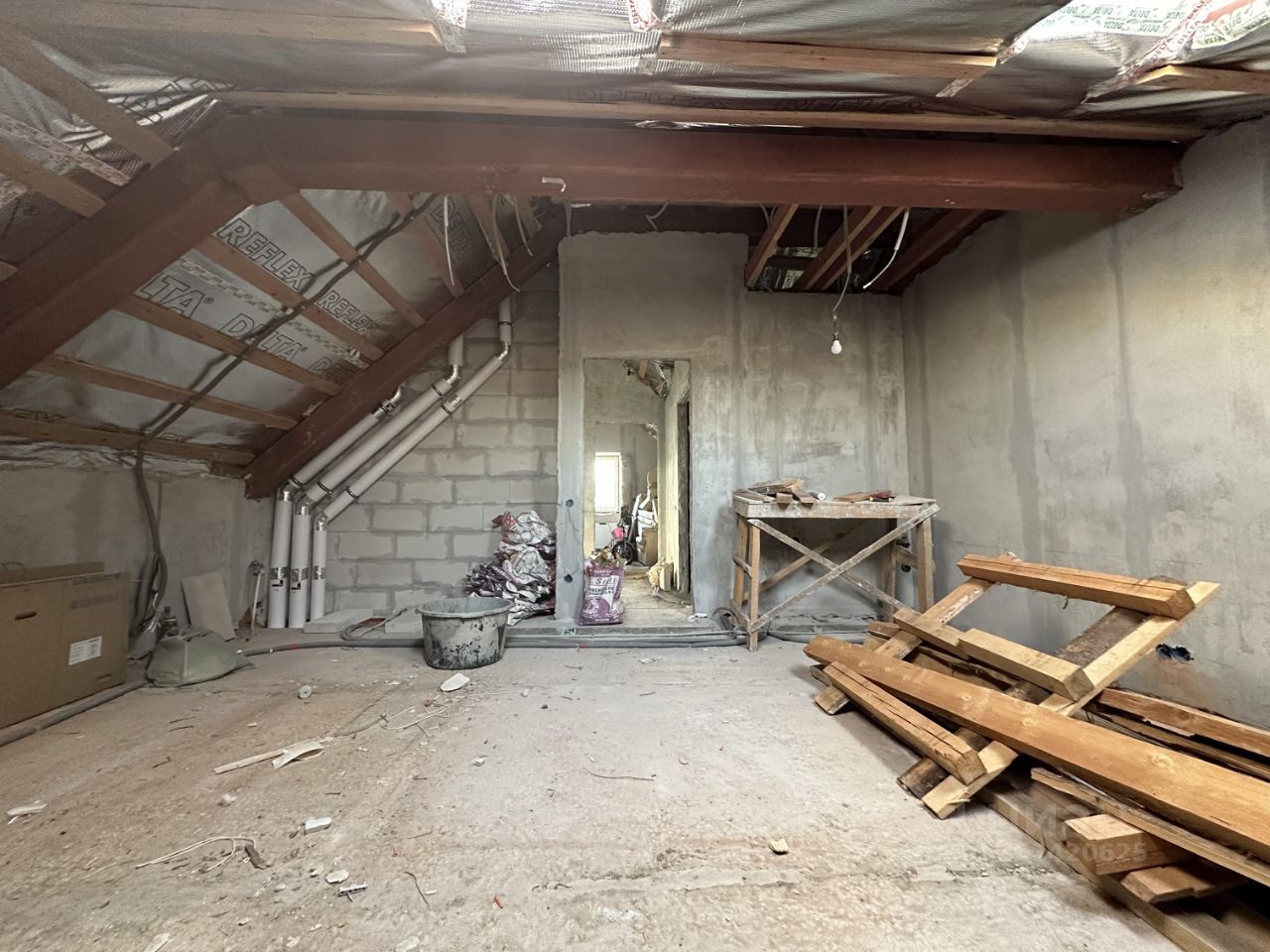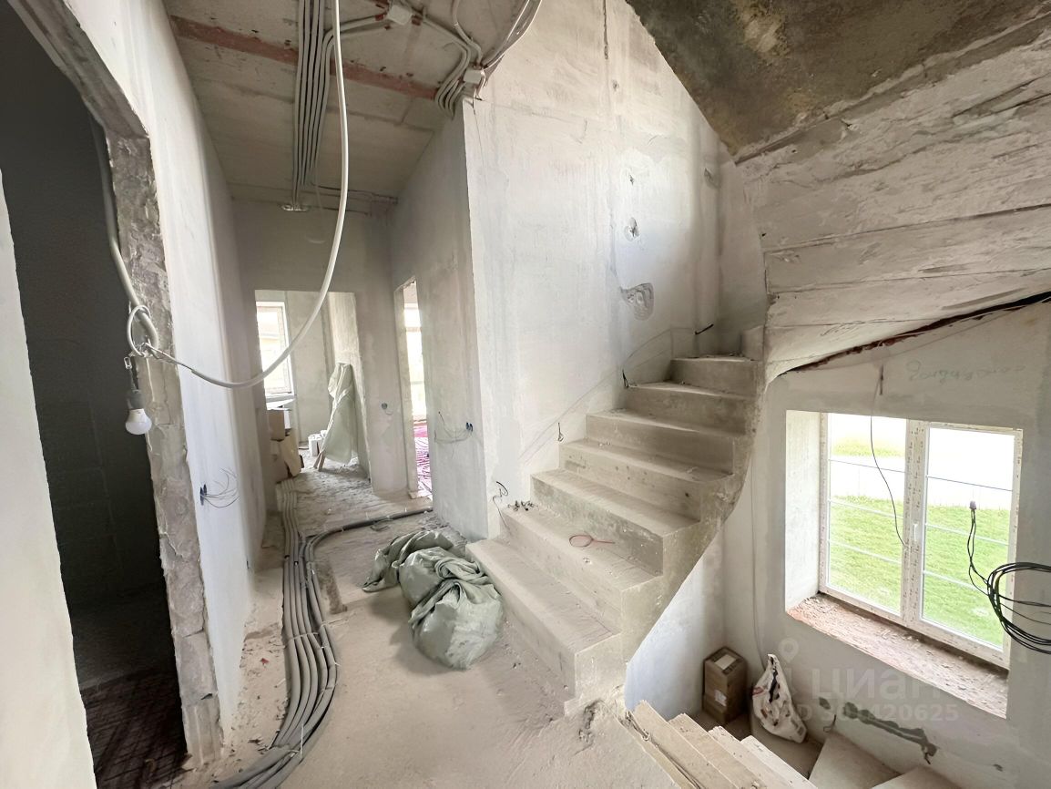 Сделан черновой ремонт: возведены стены из пазогребня, залита межэтажная лестница с первого на третий этаж, стены поштукатурены, разведена электрика и водоотведение с отоплением по всему дому,