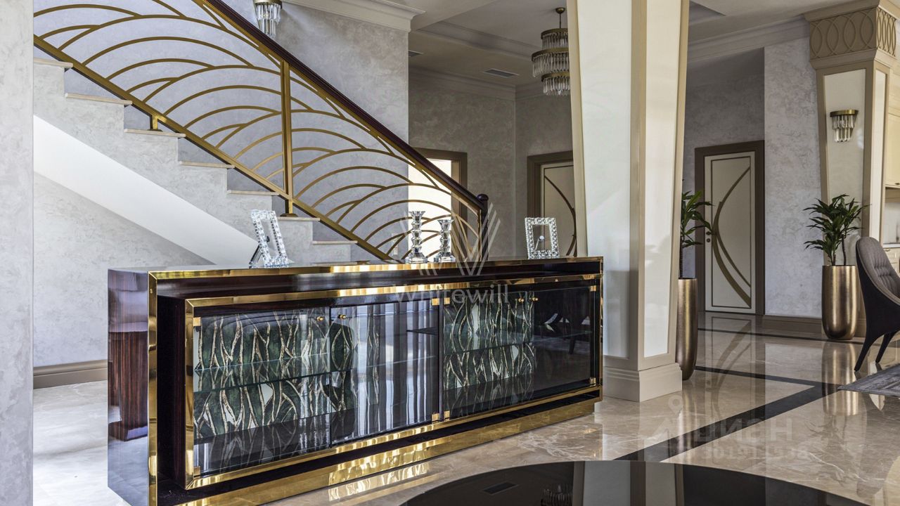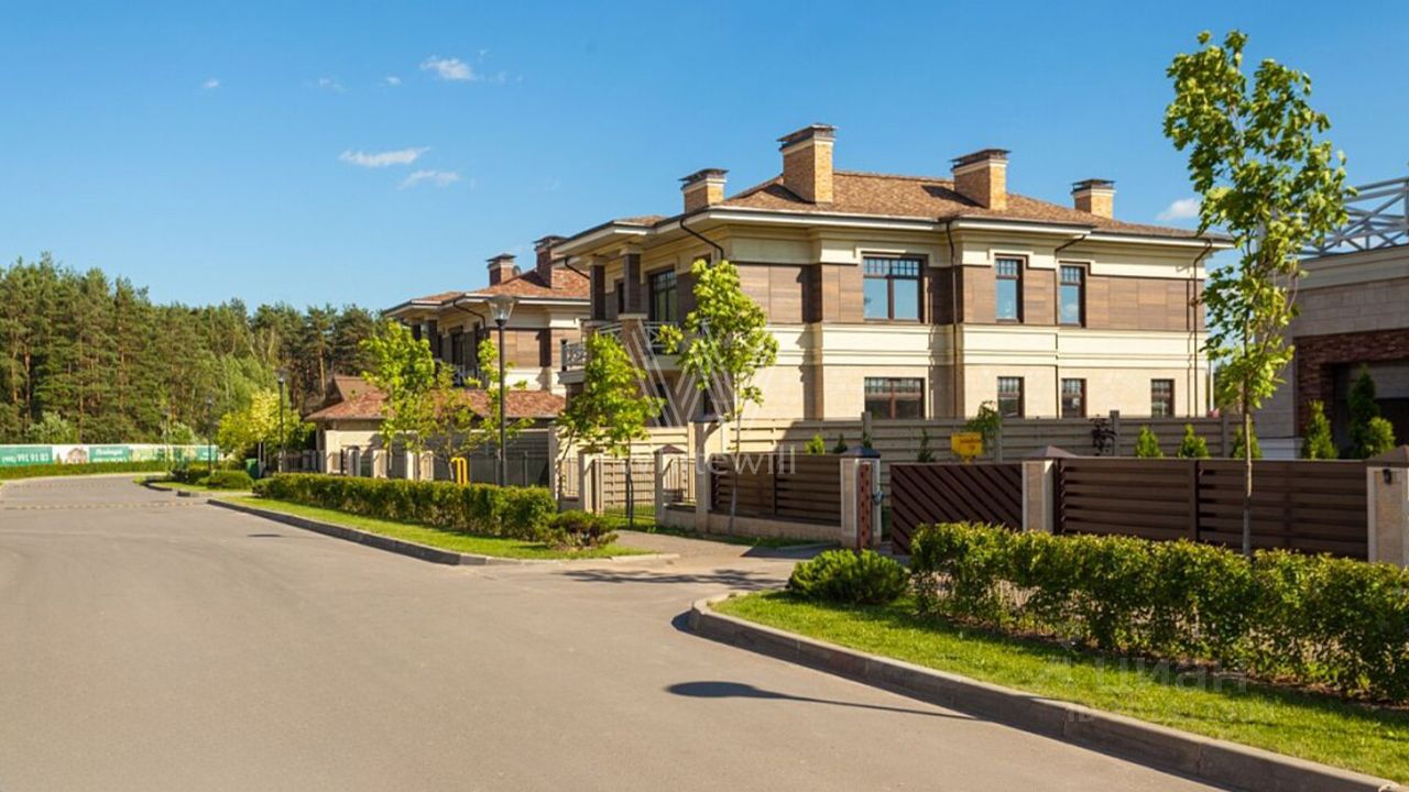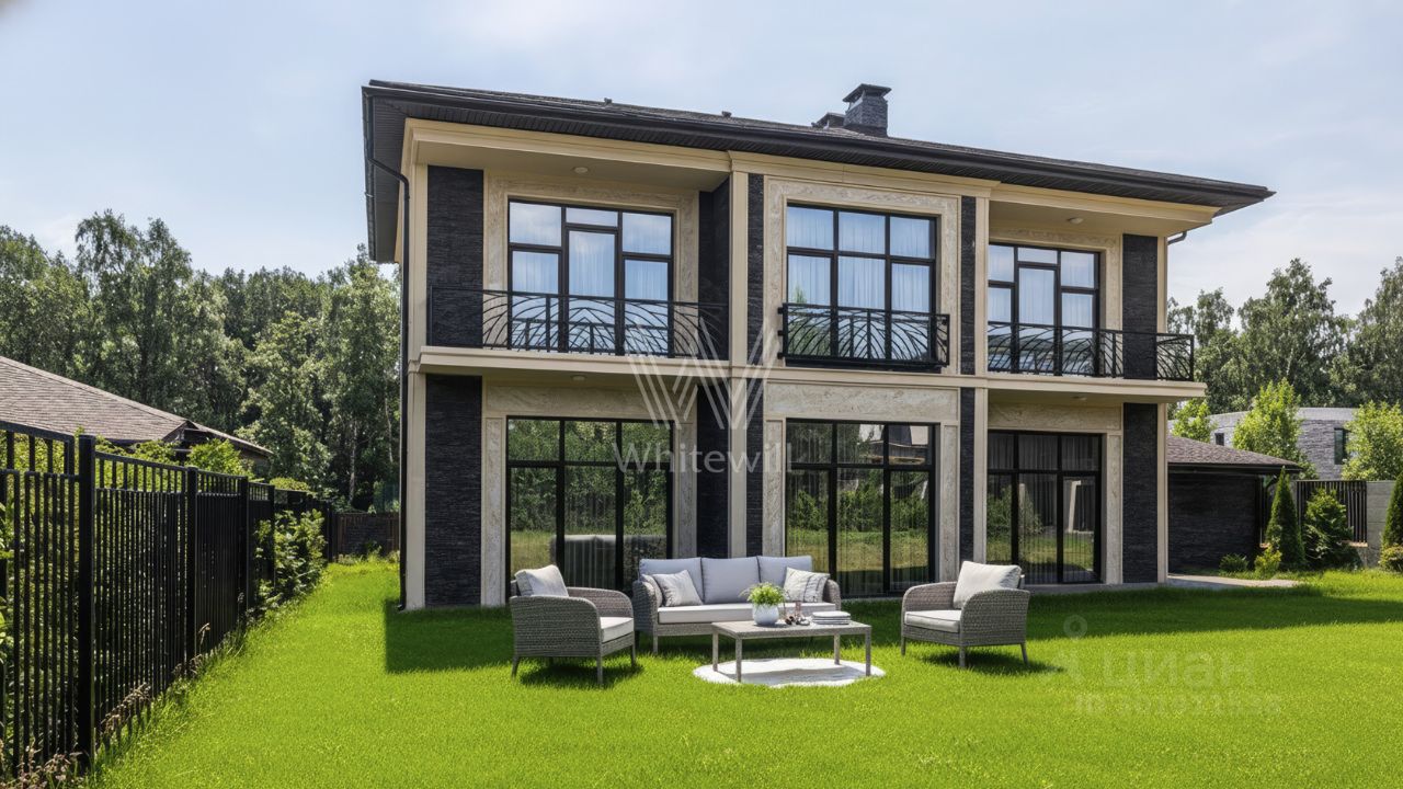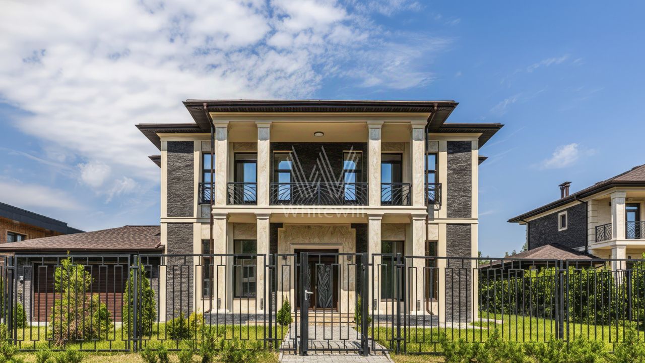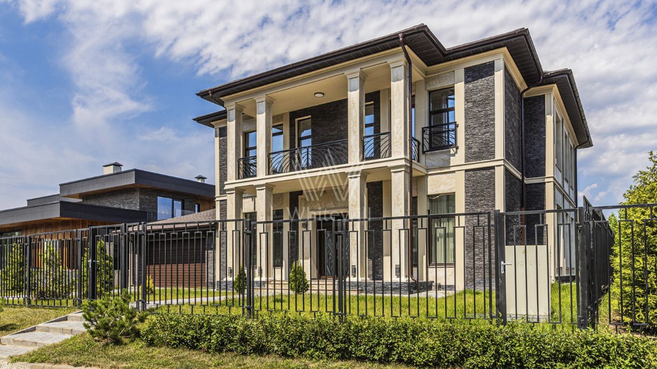 Прозорово. Загородный дом площадью 400 м² расположен на полевом участке 14 соток. Фасад в стиле современной классики облицован серой клинкерной плиткой со вставками под бежевый камень, декорирован колоннами, коваными элементами и подсветкой. Интерьер оформлен в светлых кремовых оттенках с добавлением коричневых акцентов. В резиденции спланировали 3 спальни, уютную гостиную с камином, кабинет, кухню, столовую и террасу. Предусмотрен гараж на 2 машины. На участке выполнен ландшафтный дизайн, вымощены дорожки, засеян газон и высажены туи.