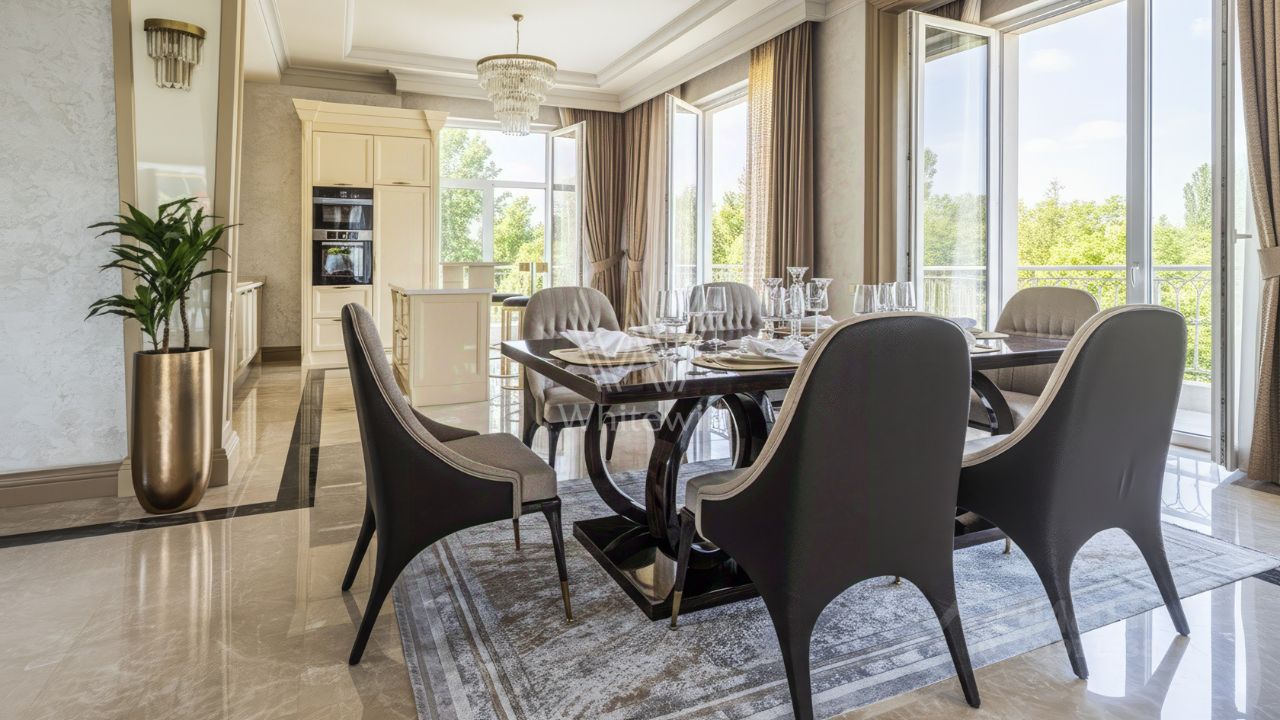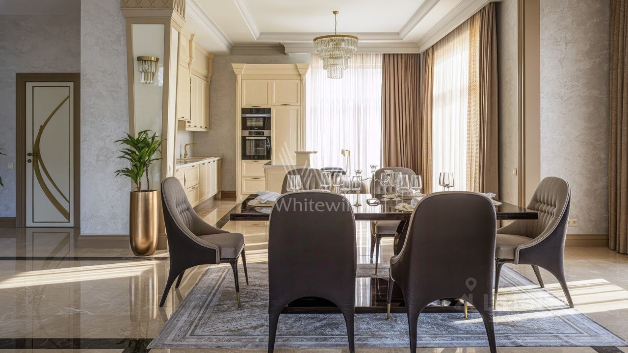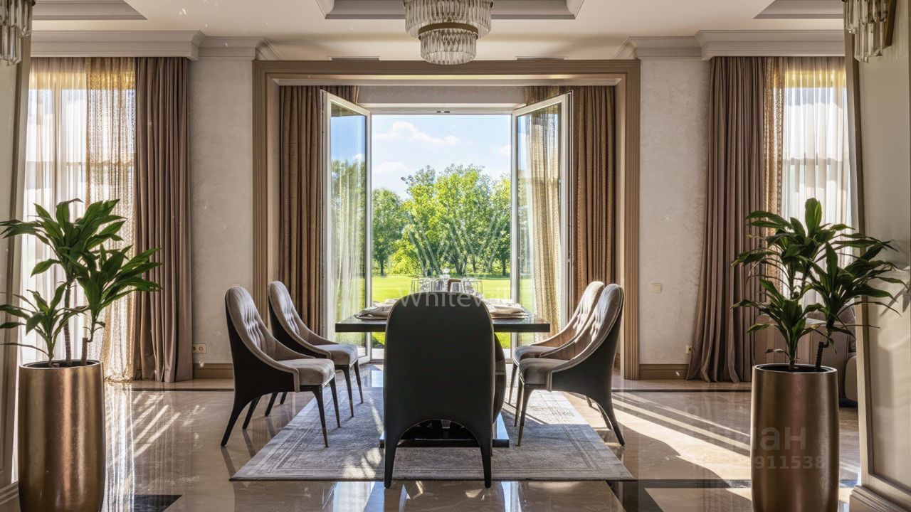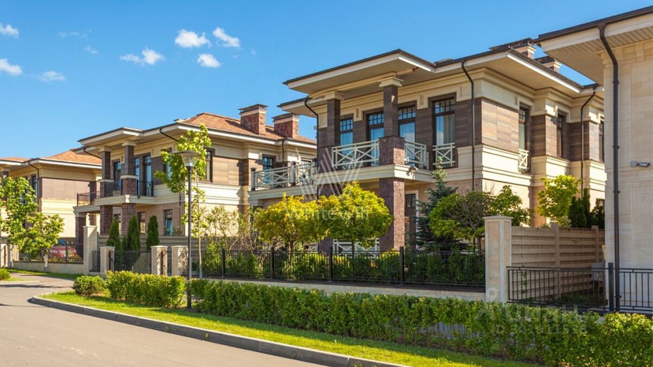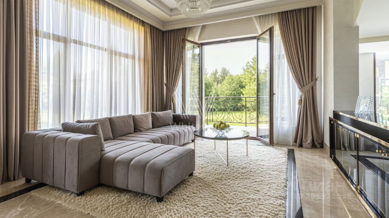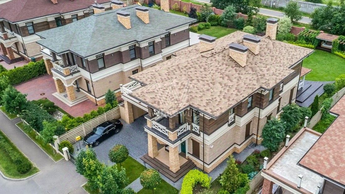Прозорово. Загородный дом площадью 400 м² расположен на полевом участке 14 соток. Фасад в стиле современной классики облицован серой клинкерной плиткой со вставками под бежевый камень, декорирован колоннами, коваными элементами и подсветкой. Интерьер оформлен в светлых кремовых оттенках с добавлением коричневых акцентов. В резиденции спланировали 3 спальни, уютную гостиную с камином, кабинет, кухню, столовую и террасу. Предусмотрен гараж на 2 машины. На участке выполнен ландшафтный дизайн, вымощены дорожки, засеян газон и высажены туи.