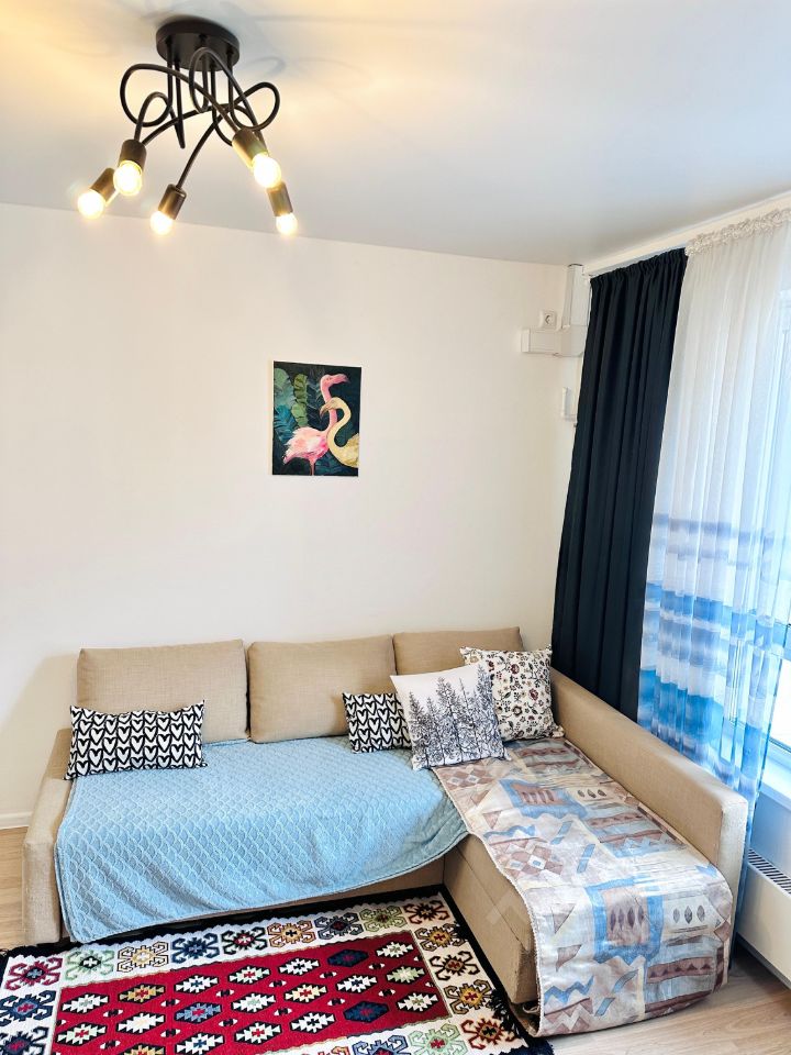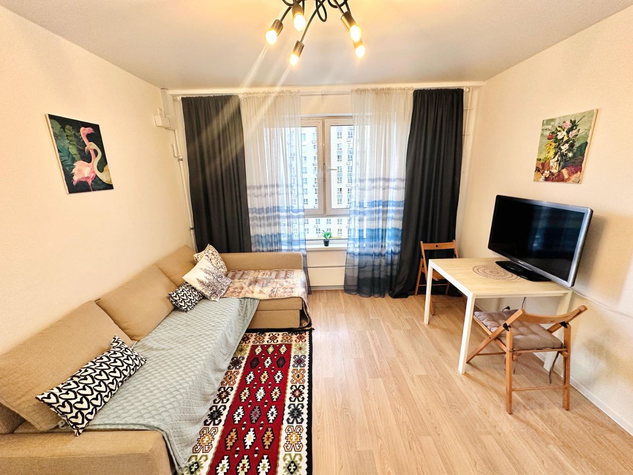 Студия очень уютная, новый ремонт, оборудована всем необходимым: кухонный гарнитур, эл.варочная панель, холодильник, микроволновая печь, стиральная машина, двуспальный диван, телевизор. Окна выходят на лес. Прямо рядом с домом лес с пешеходными маршрутами. В пешей доступности все магазины, салоны красоты, Окей, Вейпарк. Во дворе огромная игровая площадка.