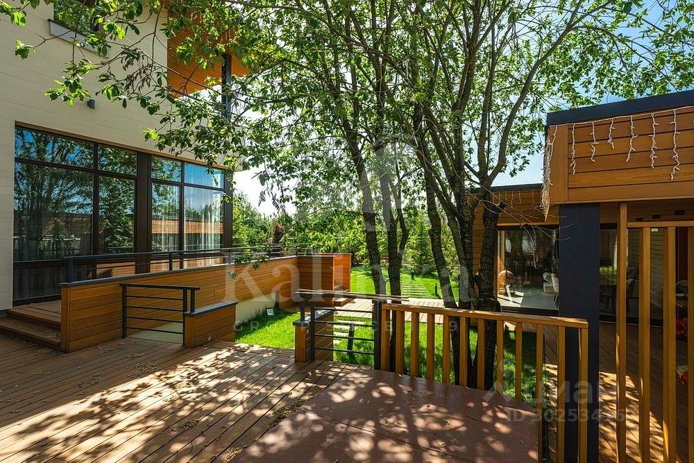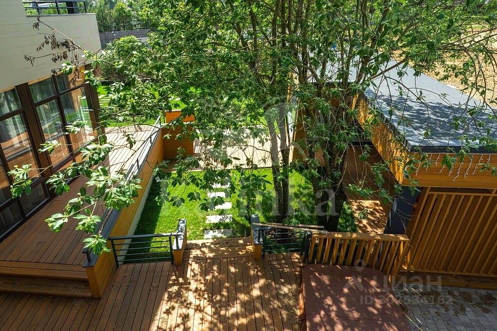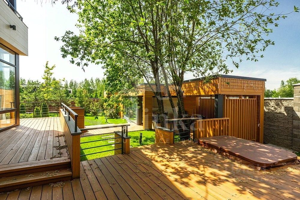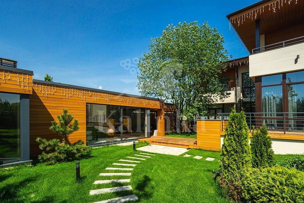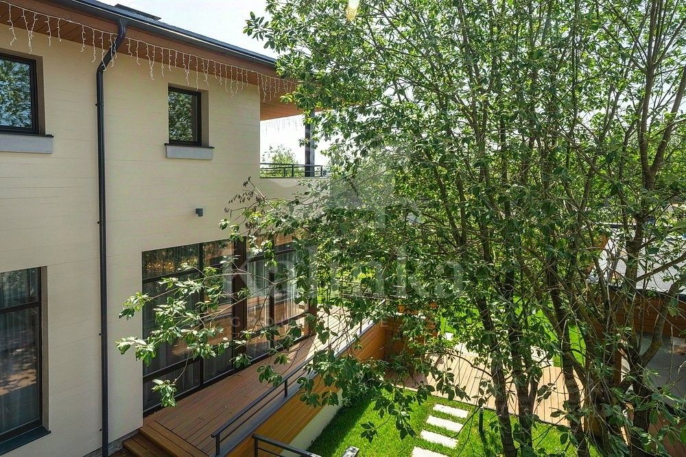 На участке выполнен ландшафтный дизайн, вымощены дорожки, установлено освещение и фасадная подсветка, автоматический полив, высажены декоративные деревья и крупномеры (сосны, ели, красные канадские клены, каштаны и др.), выложен элитный рулонный газон. Отдельно на участке расположена беседка с обеденной зоной и барбекю (70 м²).