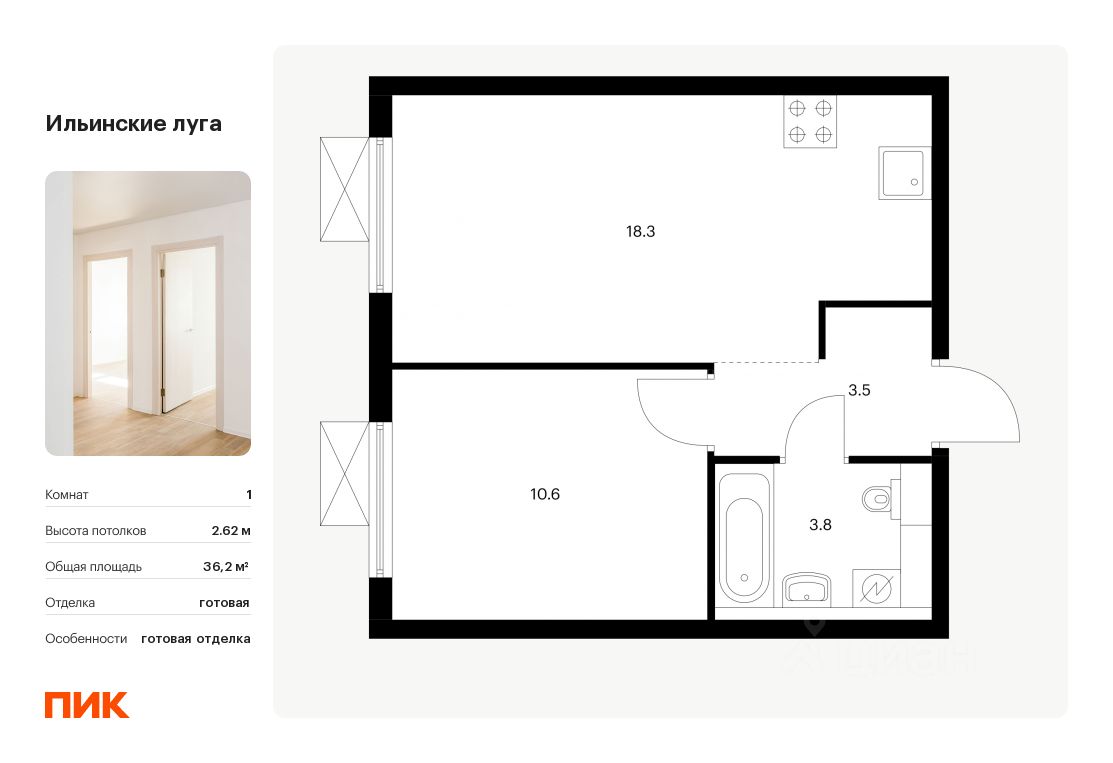 Продаётся 1-комн. квартира площадью 36,2 кв.м на 2 этаже 9 этажного дома (Корпус 2.8, Секция 1) проекта ПИК Ильинские луга. Светлый просторный подъезд на уровне земли, функциональная планировка, большие окна, c отделкой.