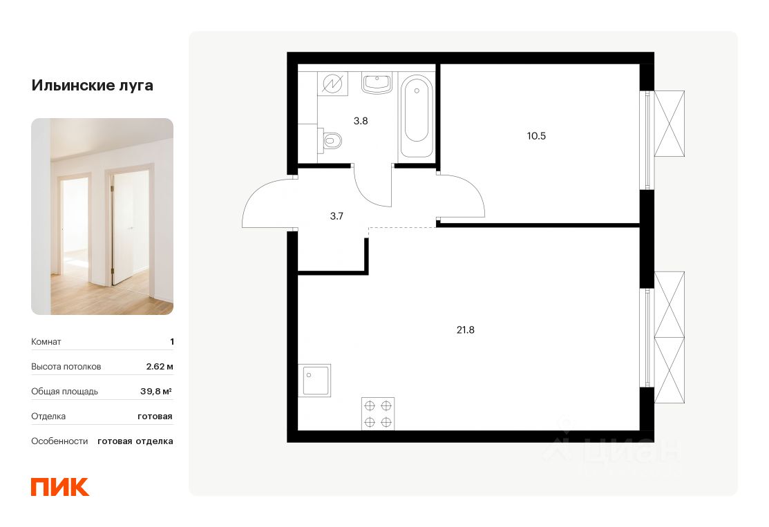 Продаётся 1-комн. квартира площадью 39,8 кв.м на 9 этаже 9 этажного дома (Корпус 2.8, Секция 3) проекта ПИК Ильинские луга. Светлый просторный подъезд на уровне земли, функциональная планировка, большие окна, c отделкой.