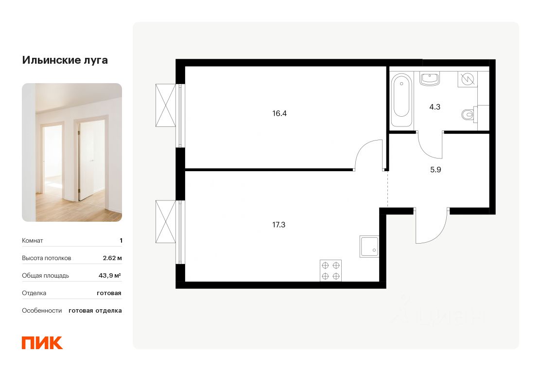 Продаётся 1-комн. квартира площадью 43,9 кв.м на 9 этаже 9 этажного дома (Корпус 2.8, Секция 6) проекта ПИК Ильинские луга. Светлый просторный подъезд на уровне земли, функциональная планировка, большие окна, c отделкой.
