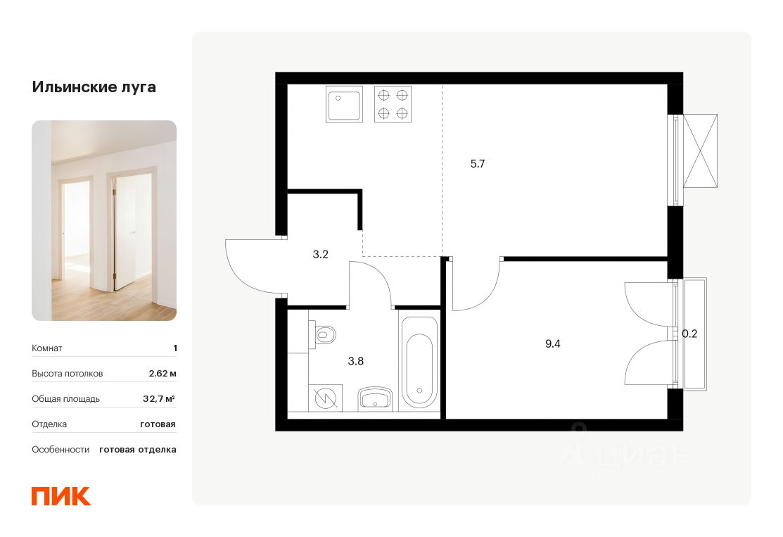 Продаётся 1-комн. квартира площадью 32,7 кв.м на 7 этаже 9 этажного дома (Корпус 2.9, Секция 1) проекта ПИК Ильинские луга. Светлый просторный подъезд на уровне земли, функциональная планировка, большие окна, c отделкой.