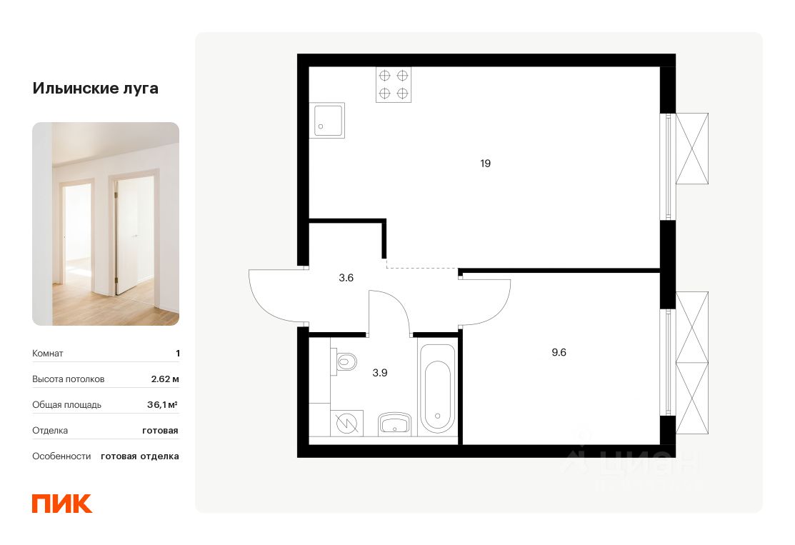 Продаётся 1-комн. квартира площадью 36,1 кв.м на 9 этаже 9 этажного дома (Корпус 2.8, Секция 4) проекта ПИК Ильинские луга. Светлый просторный подъезд на уровне земли, функциональная планировка, большие окна, c отделкой.