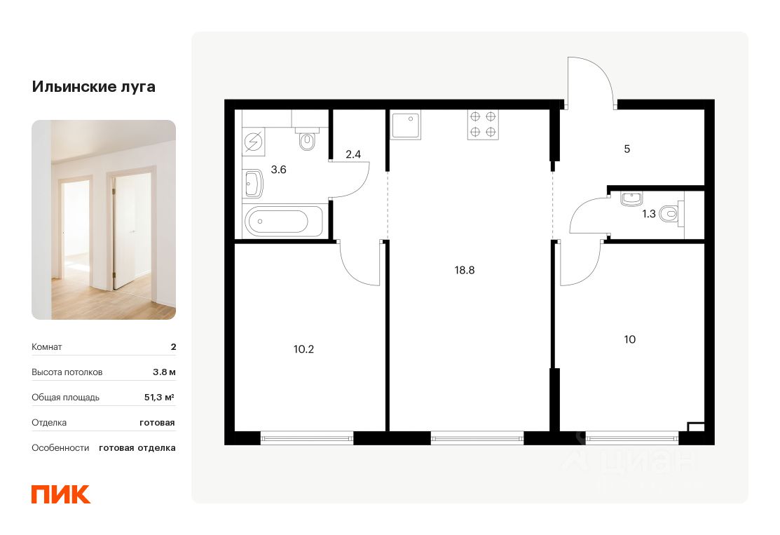 Продаётся 2-комн. квартира площадью 51,3 кв.м на 1 этаже 9 этажного дома (Корпус 2.9, Секция 3) проекта ПИК Ильинские луга. Светлый просторный подъезд на уровне земли, функциональная планировка, большие окна, c отделкой.
