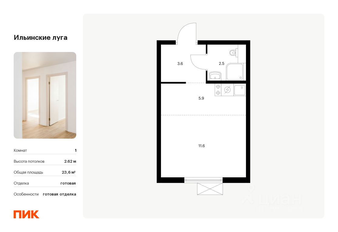 Продаётся квартира-студия площадью 23,6 кв.м на 3 этаже 9 этажного дома (Корпус 2.9, Секция 1) проекта ПИК Ильинские луга. Светлый просторный подъезд на уровне земли, функциональная планировка, большие окна, c отделкой.