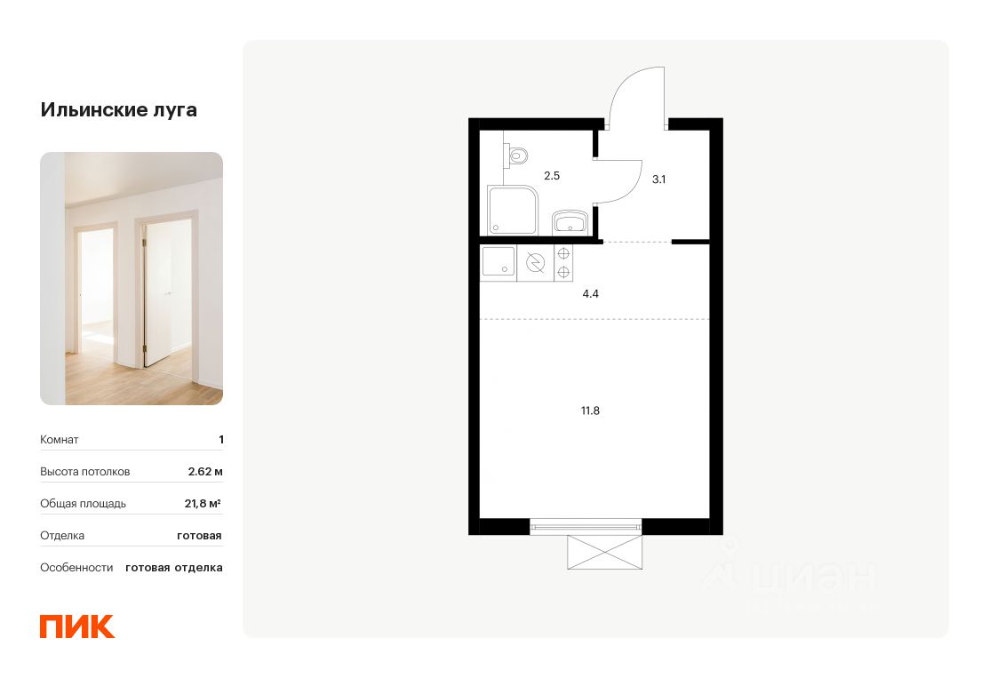 Продаётся квартира-студия площадью 21,8 кв.м на 8 этаже 9 этажного дома (Корпус 2.8, Секция 3) проекта ПИК Ильинские луга. Светлый просторный подъезд на уровне земли, функциональная планировка, большие окна, c отделкой.
