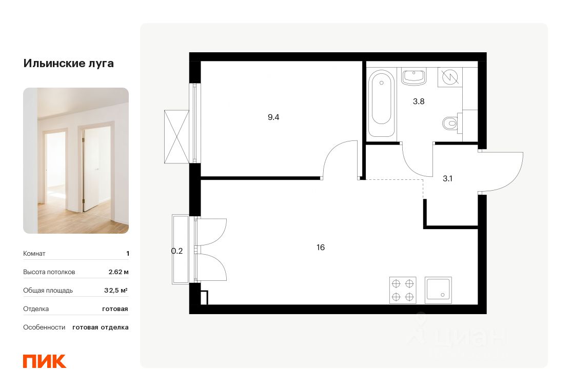 Продаётся 1-комн. квартира площадью 32,5 кв.м на 9 этаже 9 этажного дома (Корпус 2.9, Секция 1) проекта ПИК Ильинские луга. Светлый просторный подъезд на уровне земли, функциональная планировка, большие окна, c отделкой.