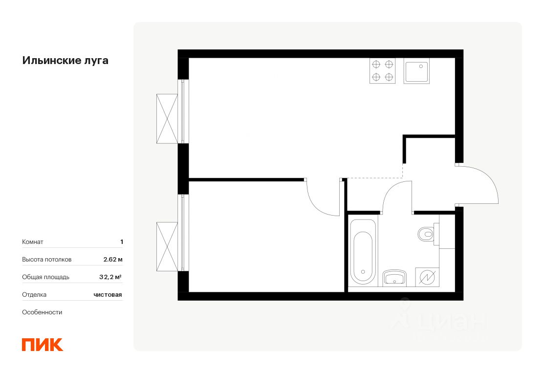 Продаётся 1-комн. квартира площадью 32,2 кв.м на 4 этаже 9 этажного дома (Корпус 2.13, Секция 1) проекта ПИК Ильинские луга. Светлый просторный подъезд на уровне земли, функциональная планировка, большие окна, c отделкой.