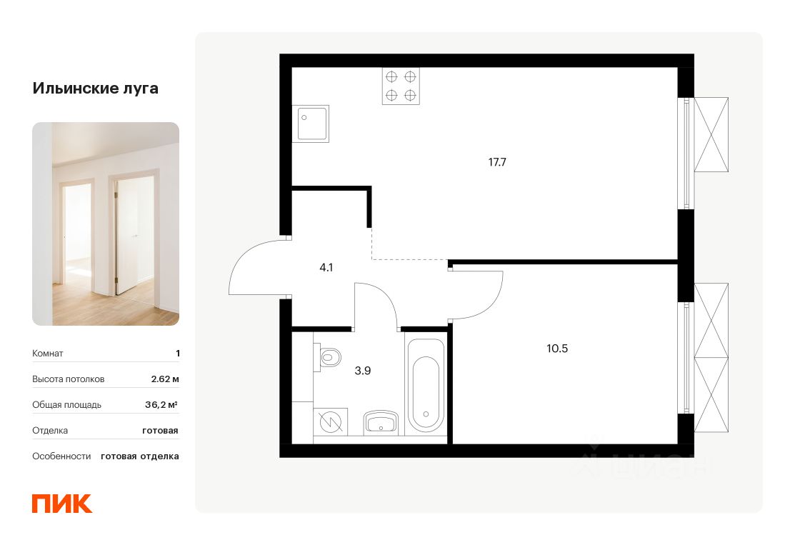Продаётся 1-комн. квартира площадью 36,2 кв.м на 9 этаже 9 этажного дома (Корпус 2.8, Секция 3) проекта ПИК Ильинские луга. Светлый просторный подъезд на уровне земли, функциональная планировка, большие окна, c отделкой.