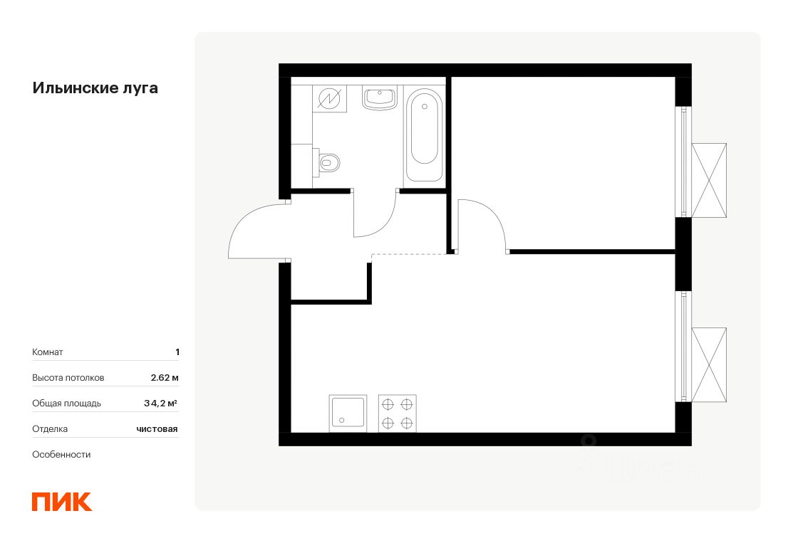 Продаётся 1-комн. квартира площадью 34,2 кв.м на 9 этаже 9 этажного дома (Корпус 2.8, Секция 1) проекта ПИК Ильинские луга. Светлый просторный подъезд на уровне земли, функциональная планировка, большие окна, c отделкой.