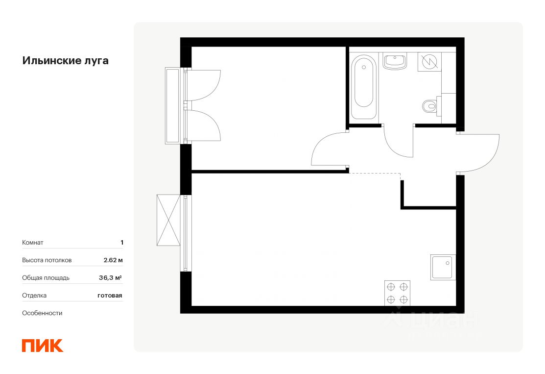 Продаётся 1-комн. квартира площадью 36,3 кв.м на 6 этаже 9 этажного дома (Корпус 2.8, Секция 4) проекта ПИК Ильинские луга. Светлый просторный подъезд на уровне земли, функциональная планировка, большие окна, .