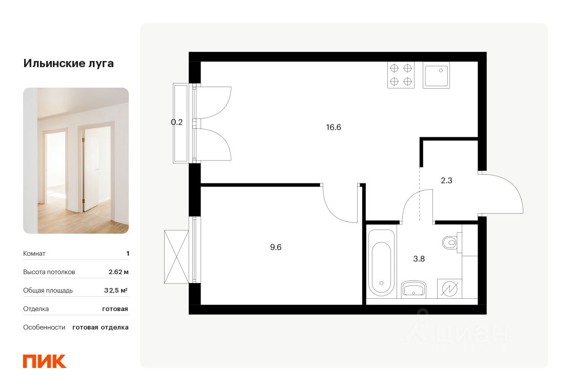 Продаётся 1-комн. квартира площадью 32,5 кв.м на 6 этаже 9 этажного дома (Корпус 2.8, Секция 3) проекта ПИК Ильинские луга. Светлый просторный подъезд на уровне земли, функциональная планировка, большие окна, c отделкой.