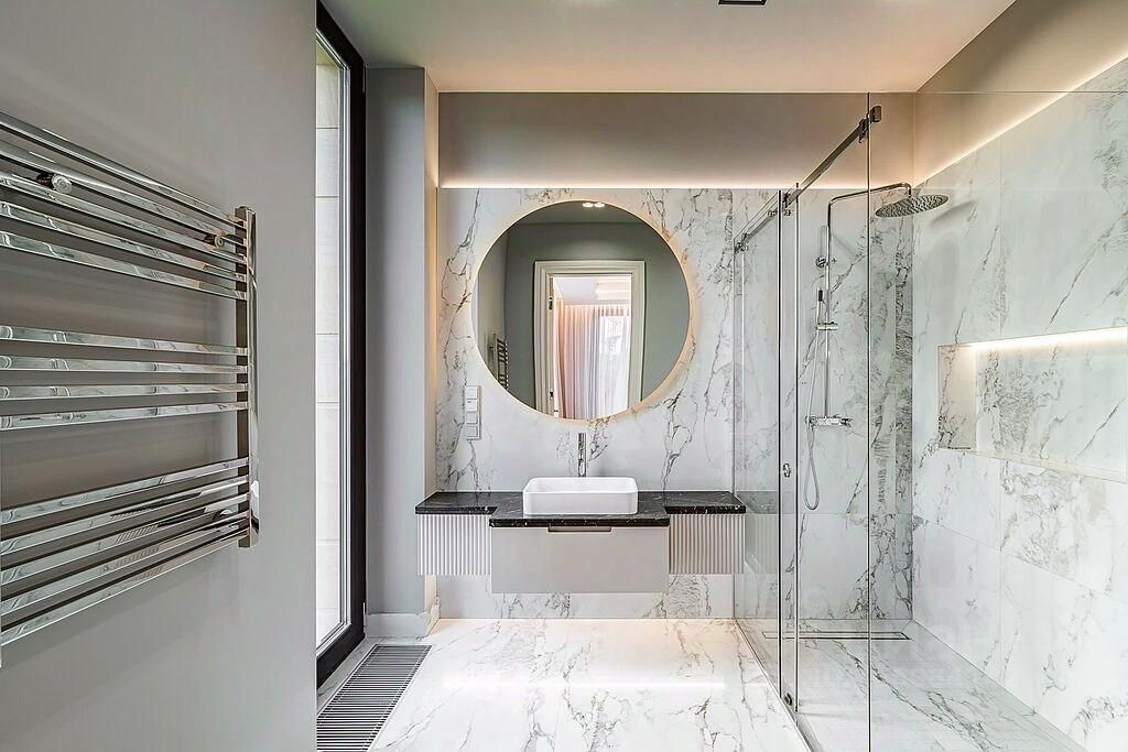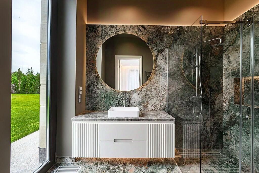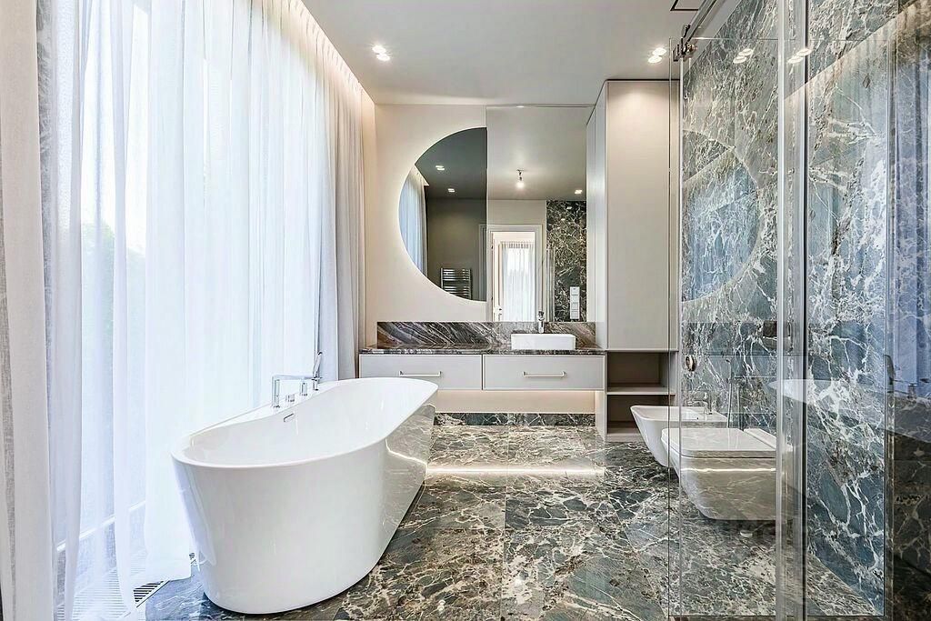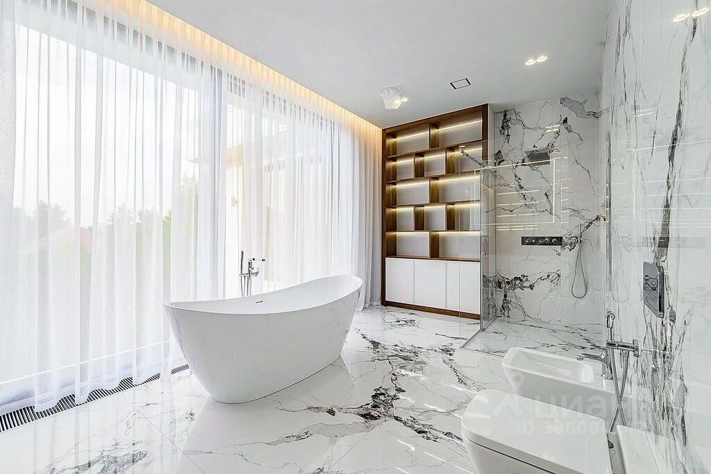 Холл со вторым светом, гостевая гардеробная, гостевой санузел, гостевая спальня с санузлом и гардеробной, кухня-столовая, гостиная с двухсторонним камином, кухня для приготовления, СПА зона с бассейном, сауной и хаммамом, террасой, постирочная, котельная, гараж на 2 авто.